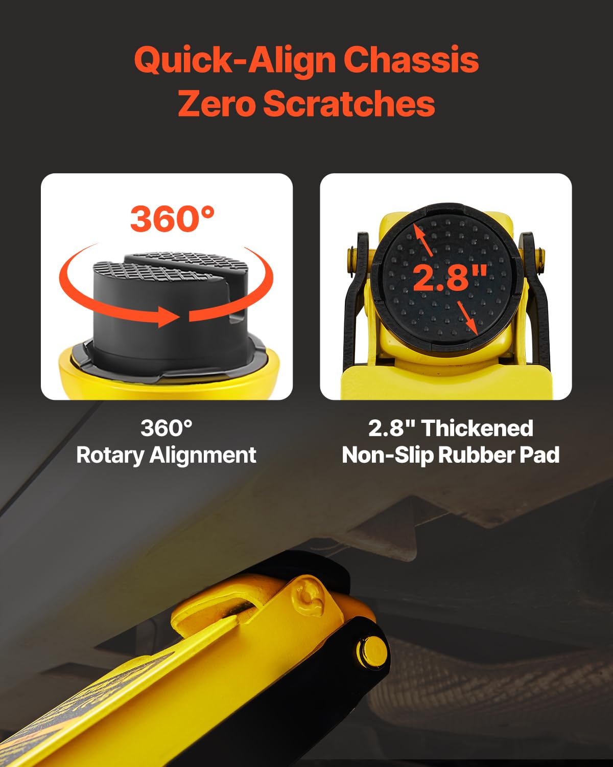 Der Wagenheber verfügt über ein integriertes Sicherheitslastsystem zum Schutz vor Überlastung. Eine Gummiauflage auf dem Auflageteller und ein Schaumstoffschutz am Pumphebel verhindern Kratzer und Beschädigungen am Fahrzeug. Die robuste Stahlkonstruktion sorgt zudem für maximale Stabilität.