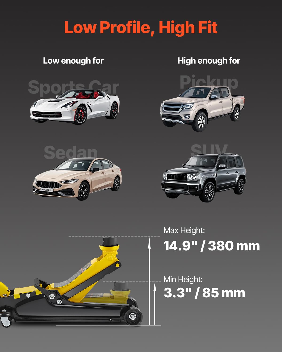 - Niedriges Profil: Dank seiner geringen minimalen Höhe von nur 85 mm passt der Heber problemlos auch unter tiefergelegte Fahrzeuge.