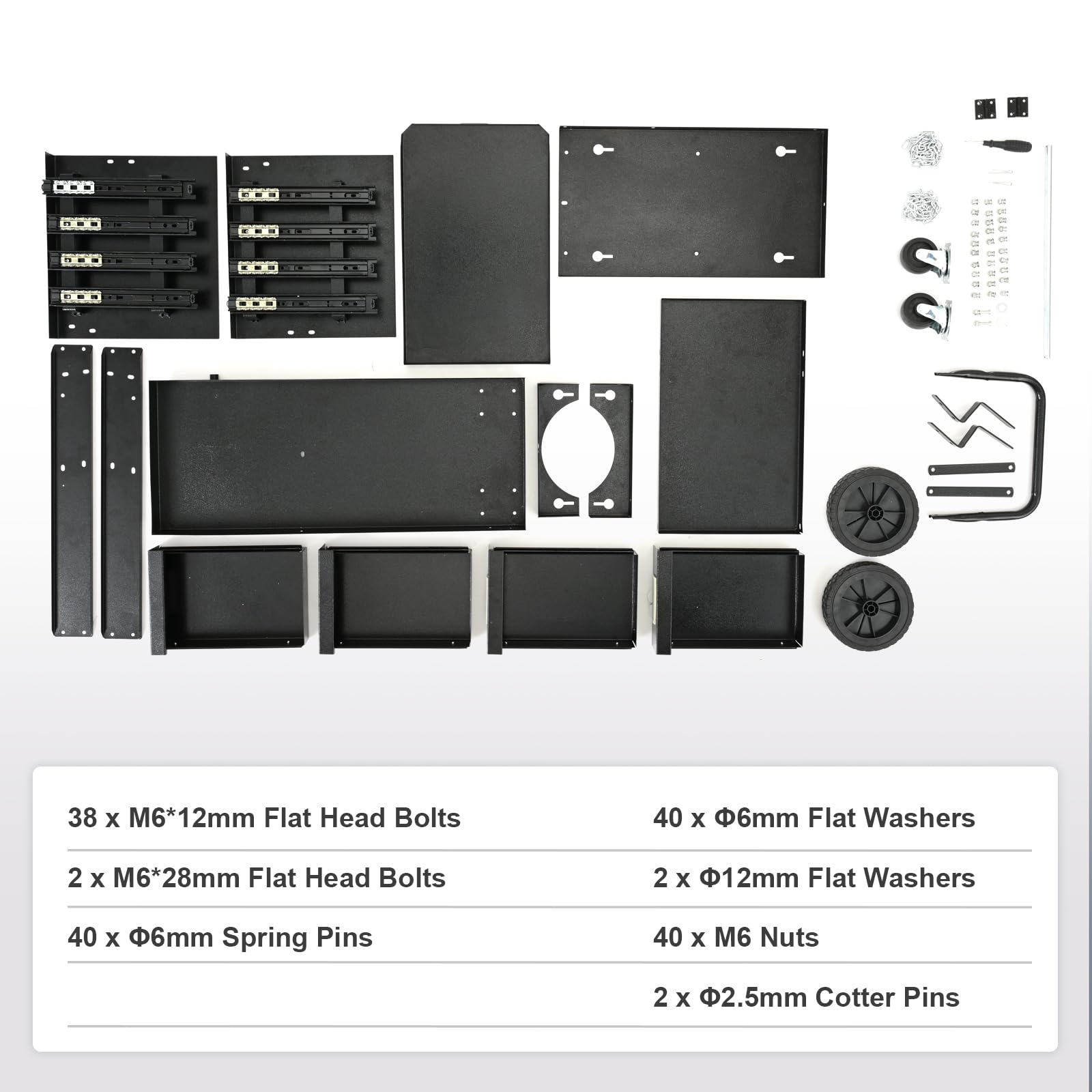 Er bietet grosszügigen und organisierten Stauraum mit zwei grossen Ablageflächen sowie vier integrierten Schubladen, die perfekt für kleineres Material, Zangen und Verbrauchsteile geeignet sind.