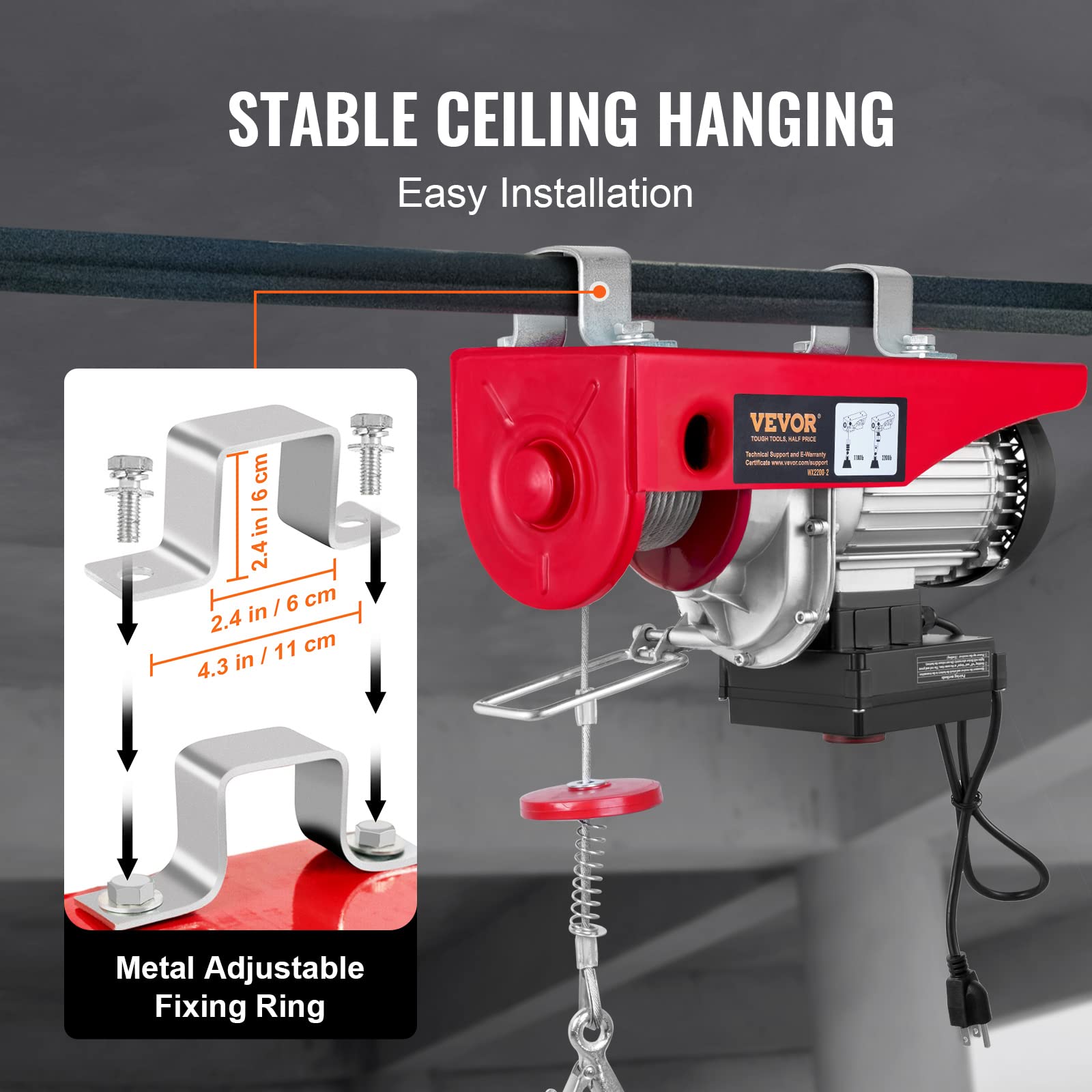 - Sichere und einfache Installation: Die Motorwinde kann unkompliziert an Deckenbalken aus Metall oder Massivholz montiert werden. Ein integrierter Not-Aus-Schalter und ein elektromagnetisches Bremssystem verhindern ein Abrutschen der Last und gewährleisten maximale Sicherheit.