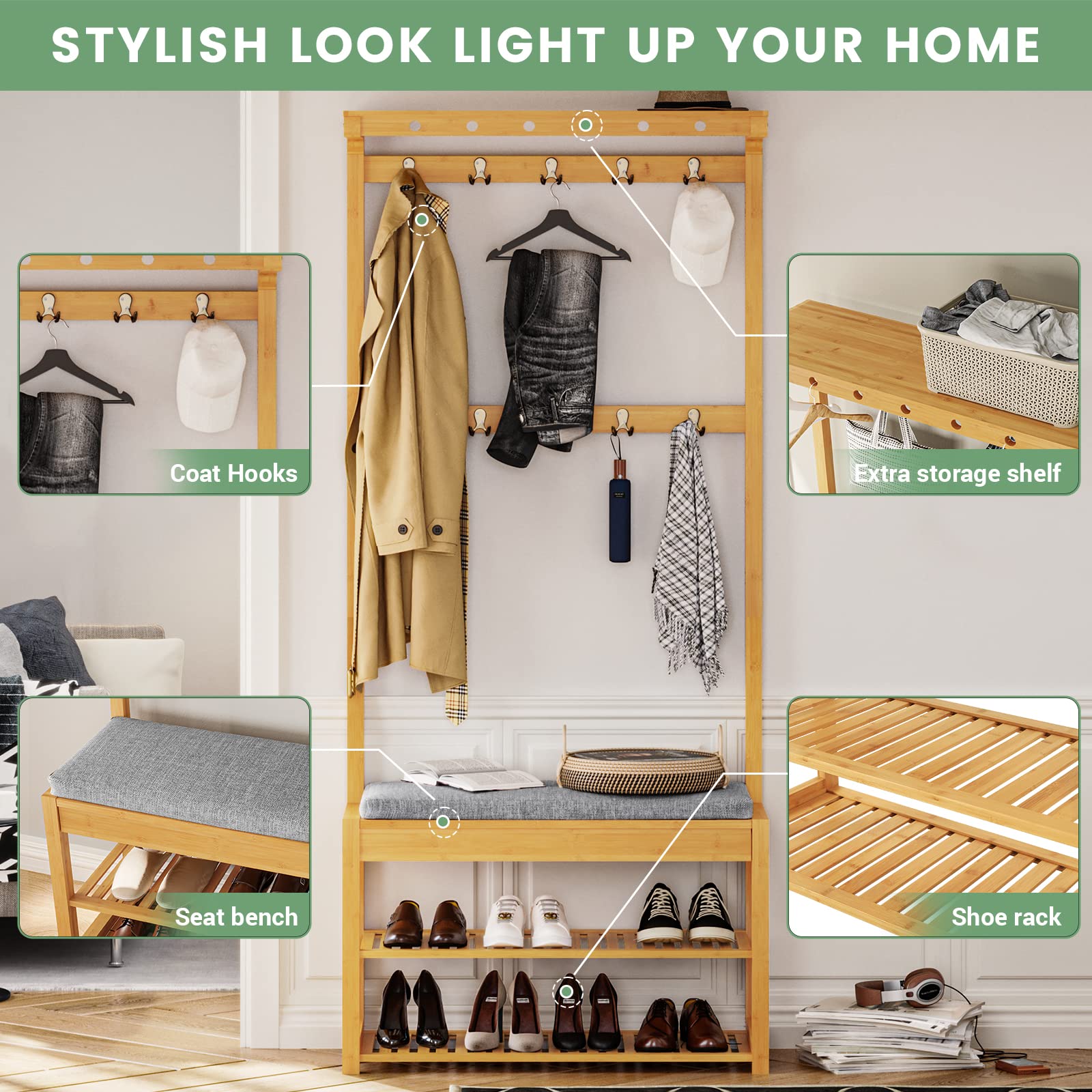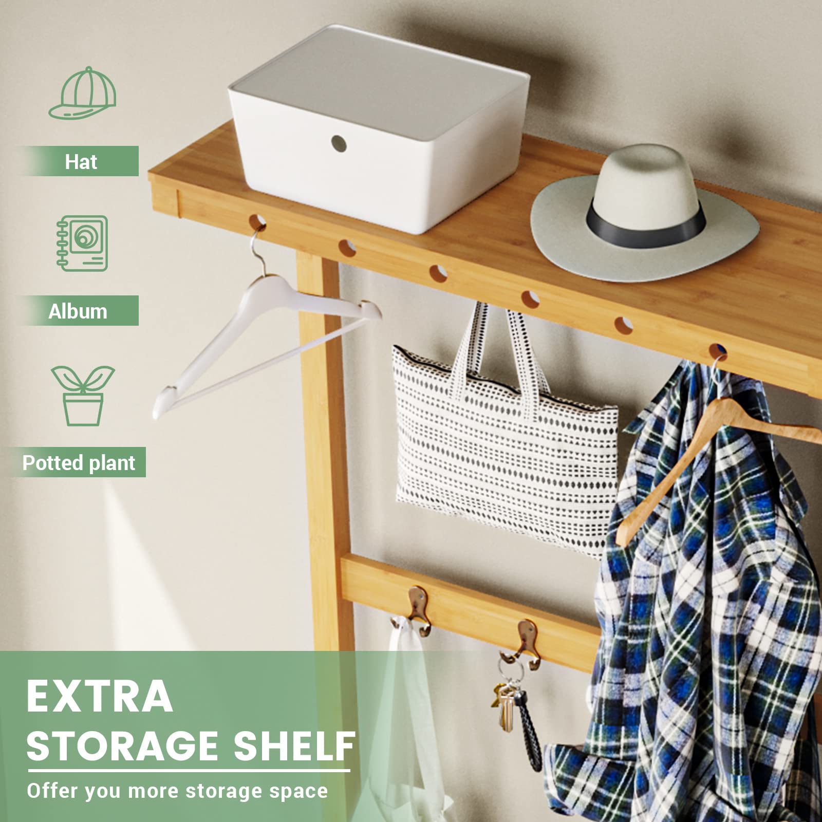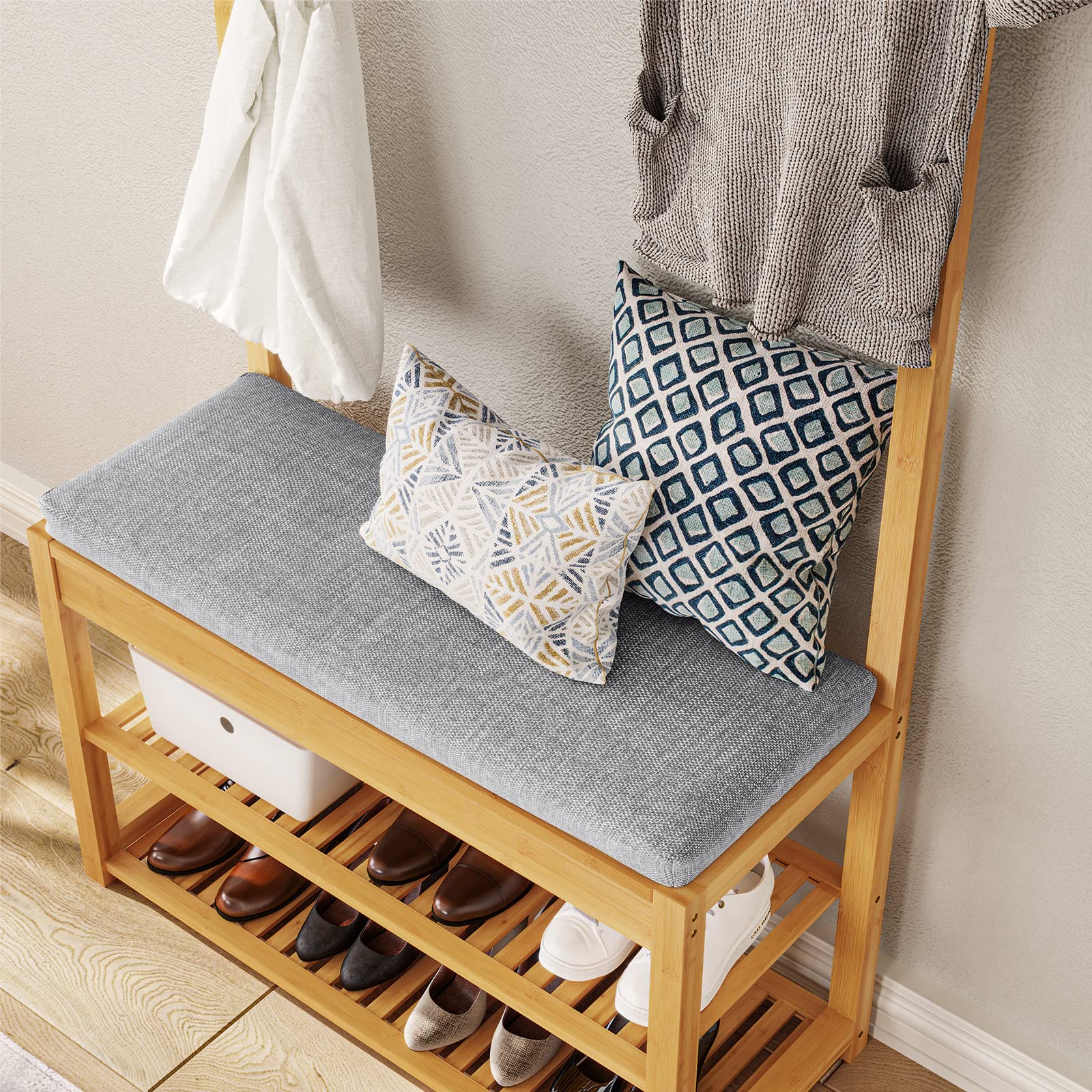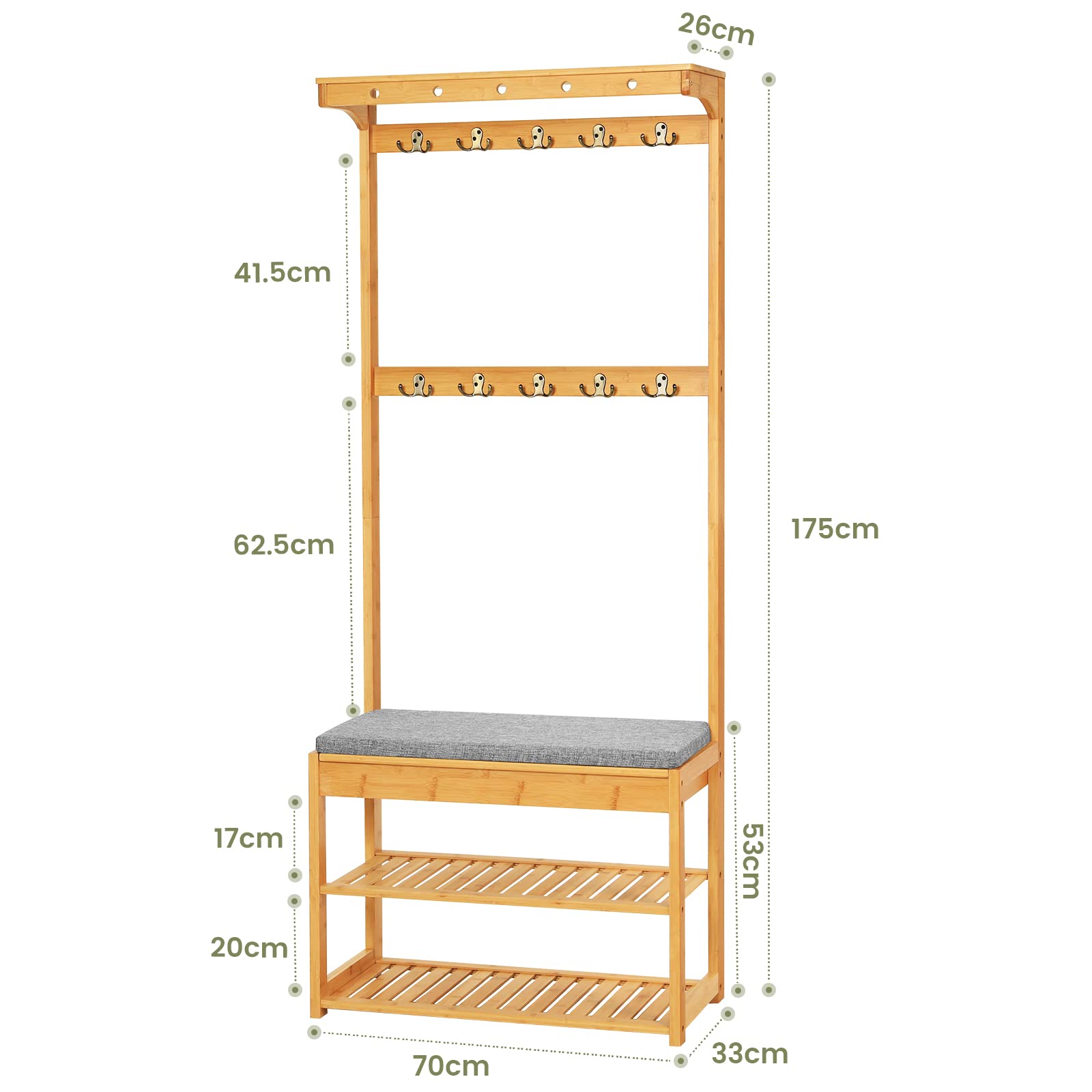 - 3-in-1 Design: Kombiniert eine Kleiderstange mit 10 Doppelhaken, eine Sitzbank und ein Schuhregal mit zwei Ebenen.