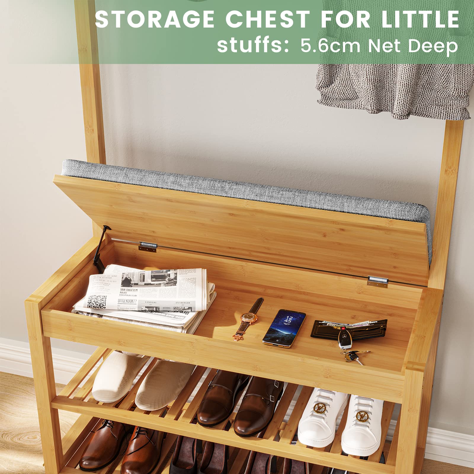 Er ist eine 3-in-1-Lösung, die einen Kleiderständer mit 10 Doppelhaken, ein Schuhregal mit zwei Ebenen und eine gepolsterte Sitzbank kombiniert. Zusätzlich bietet ein verborgenes Fach unter der Sitzfläche praktischen Stauraum für Accessoires.