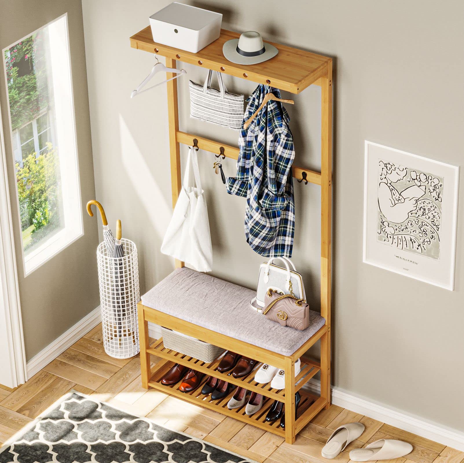 Dieser Garderobenständer aus natürlichem Bambus ist die multifunktionale Lösung für Ihren Eingangsbereich. Er vereint Kleiderständer, Schuhregal und eine bequeme Sitzbank in einem eleganten Möbelstück und schafft so auf stilvolle Weise Ordnung.