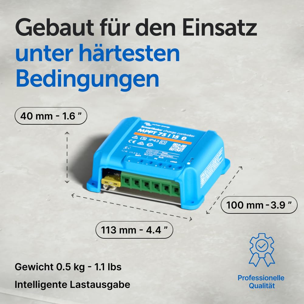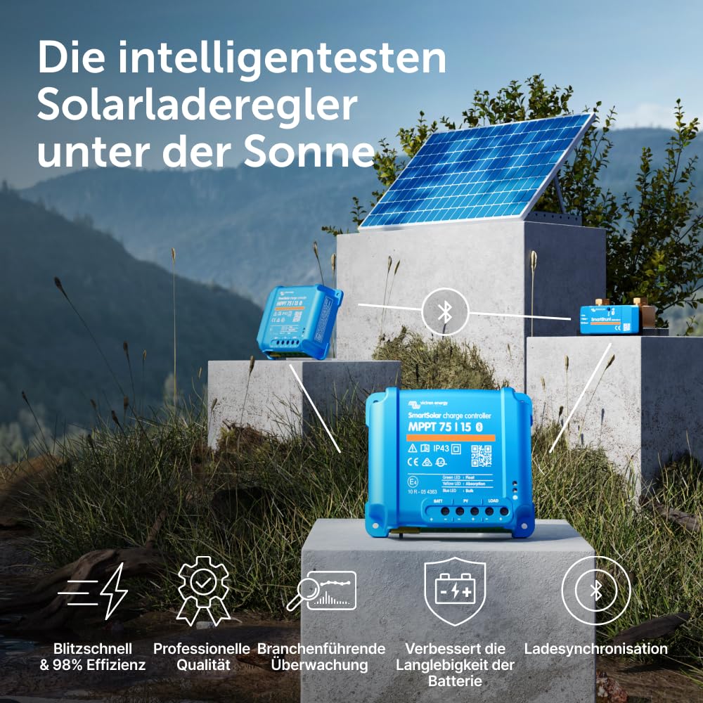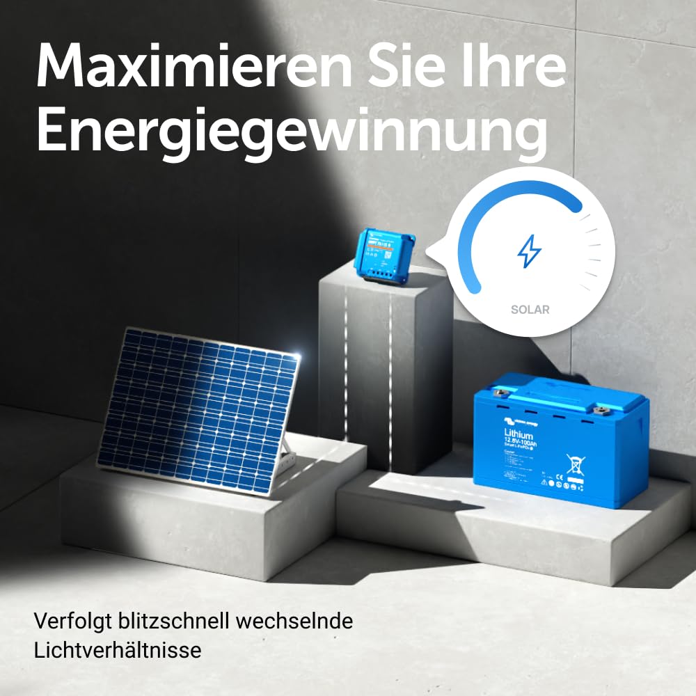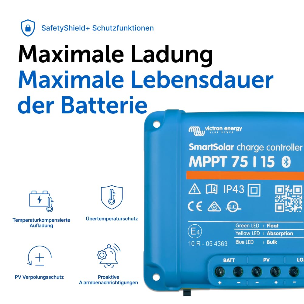 Verlängerte Batterielebensdauer: Der intelligente Ladealgorithmus des SmartSolar Reglers sorgt für eine optimale Behandlung Ihrer Batterie. Durch die präzise Steuerung des Ladevorgangs wird die Batteriegesundheit gefördert und ihre Lebensdauer nachweislich verlängert.