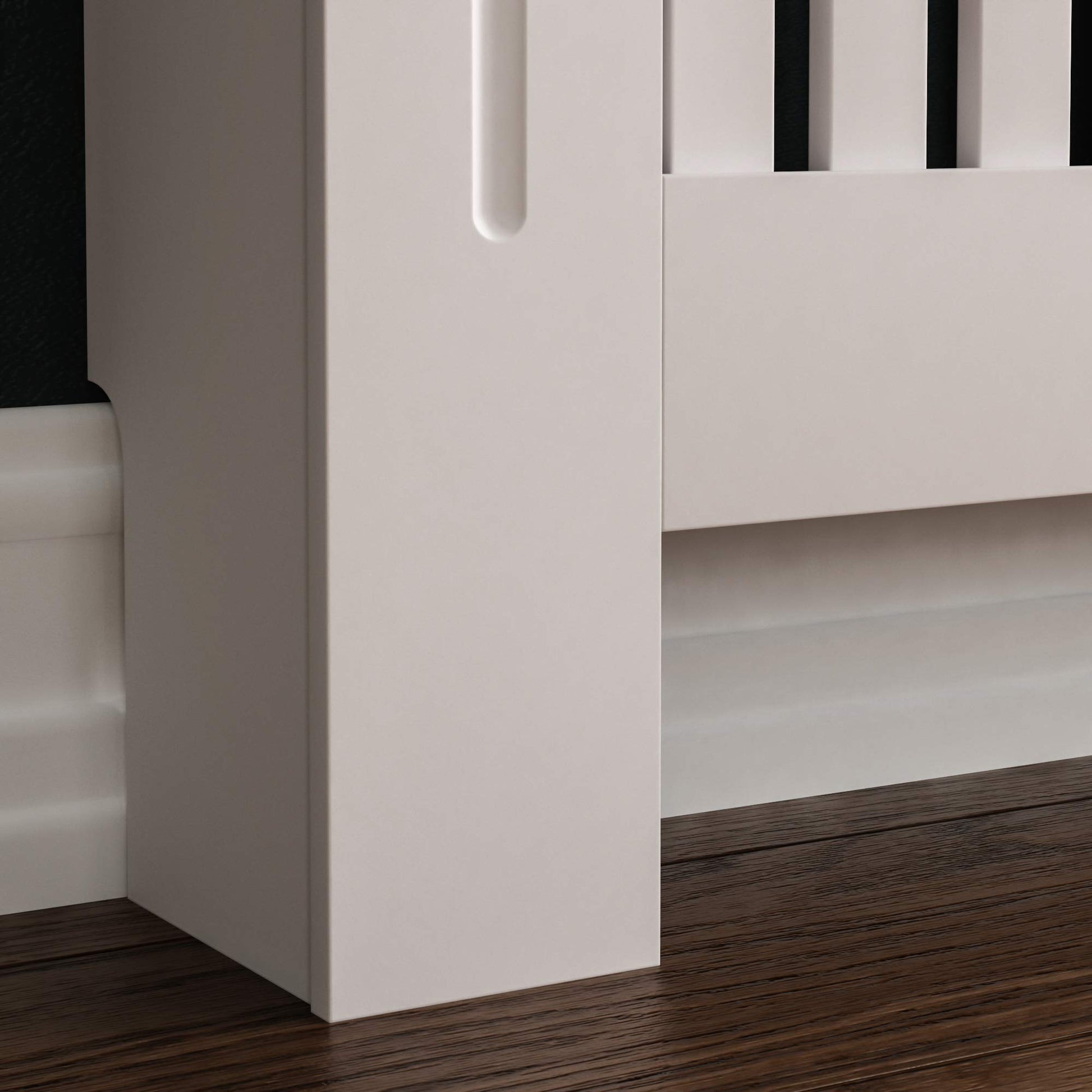 Die Abdeckung besteht aus einer robusten Kombination von MDF und Spanplatten, die für den Einsatz an Heizkörpern konzipiert ist und für Langlebigkeit sorgt. Die pulverbeschichtete Oberfläche ist widerstandsfähig und pflegeleicht.