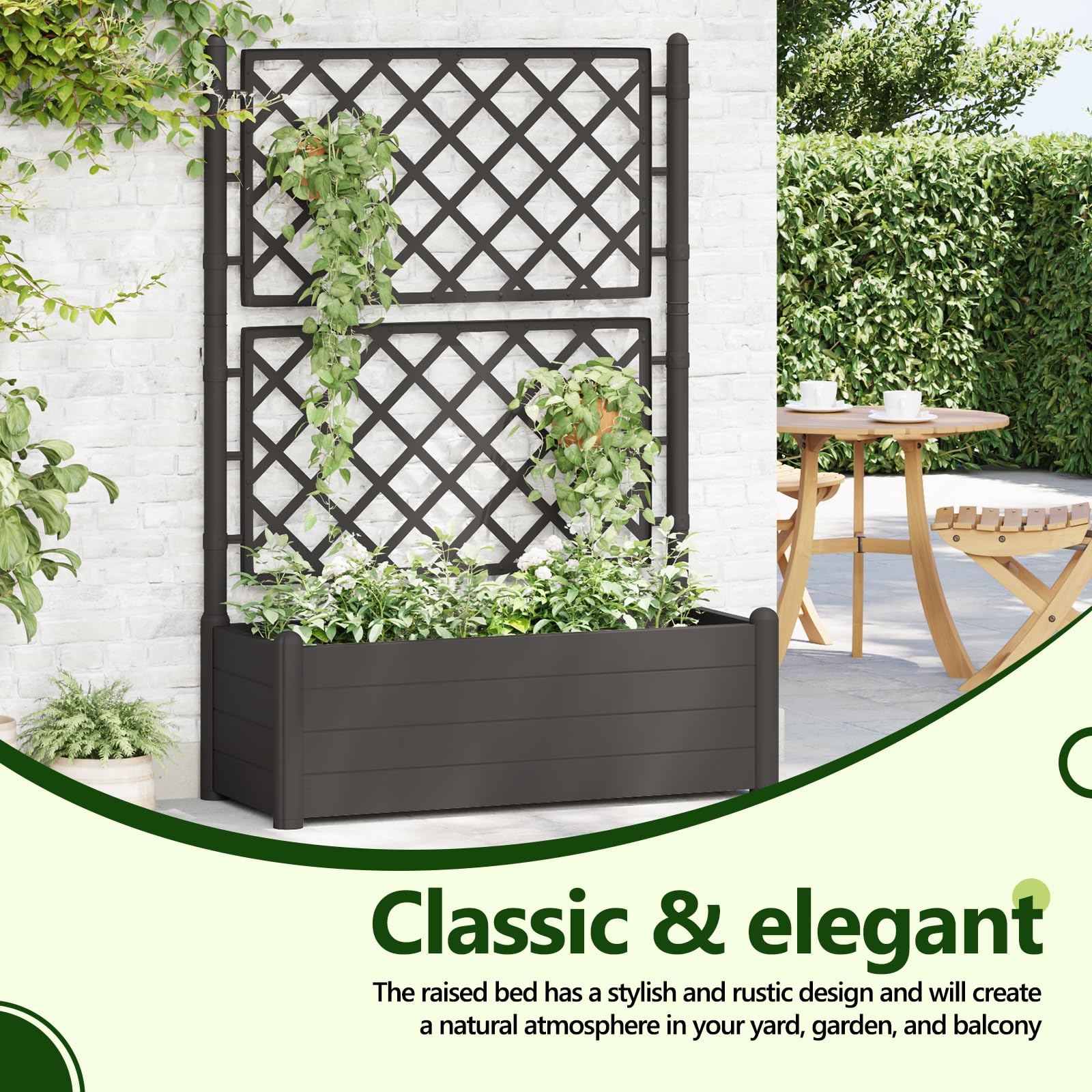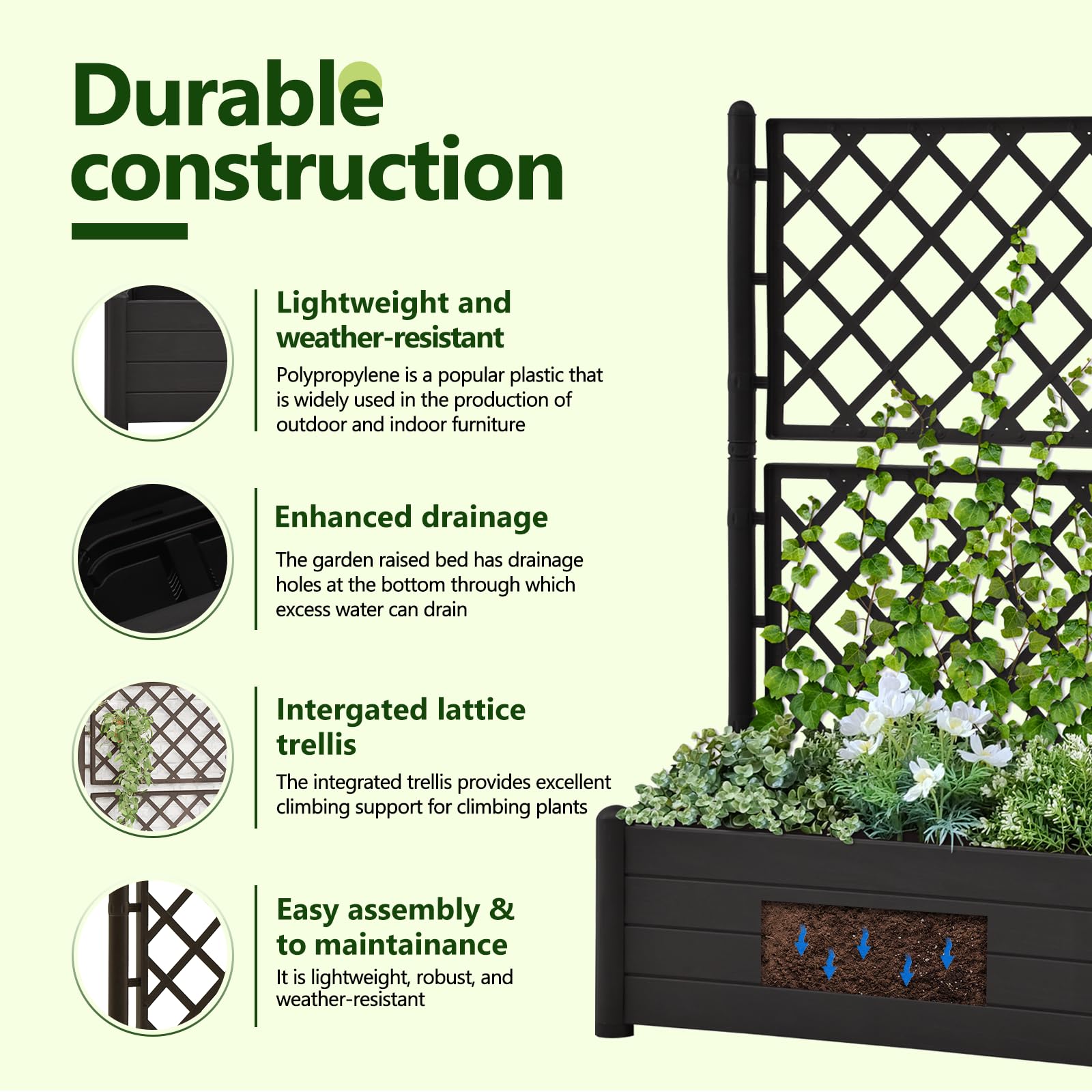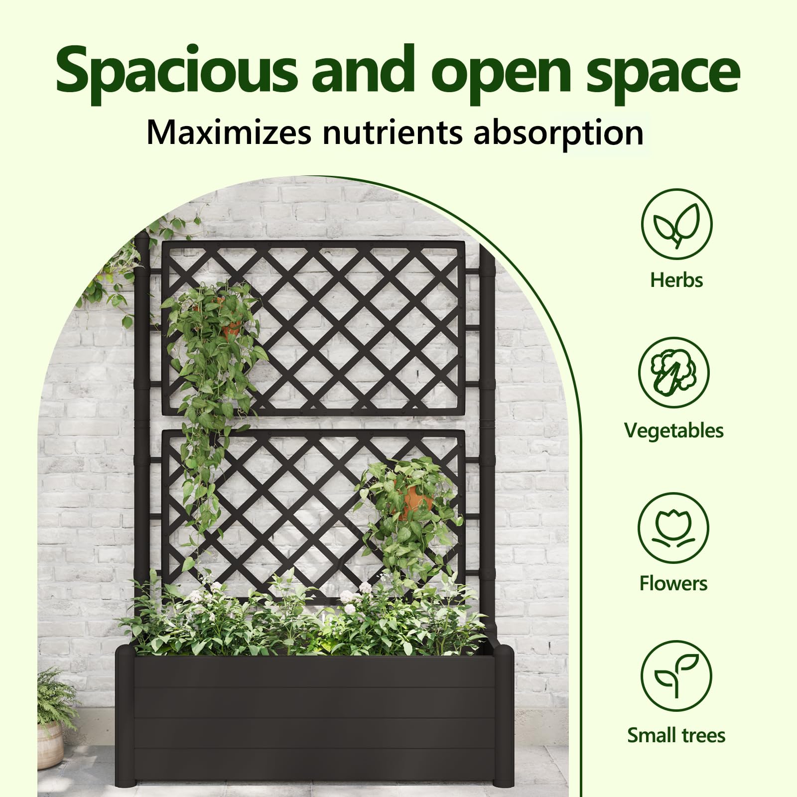 Das integrierte Spalier bietet idealen Halt für Kletterpflanzen wie Rosen, Clematis oder Efeu. Der 90-Liter-Pflanzkasten selbst bietet aber auch reichlich Platz, um Kletterpflanzen mit blühenden Blumen, Kräutern oder sogar kleinem Gemüse zu kombinieren und so eine vielfältige grüne Oase zu schaffen.