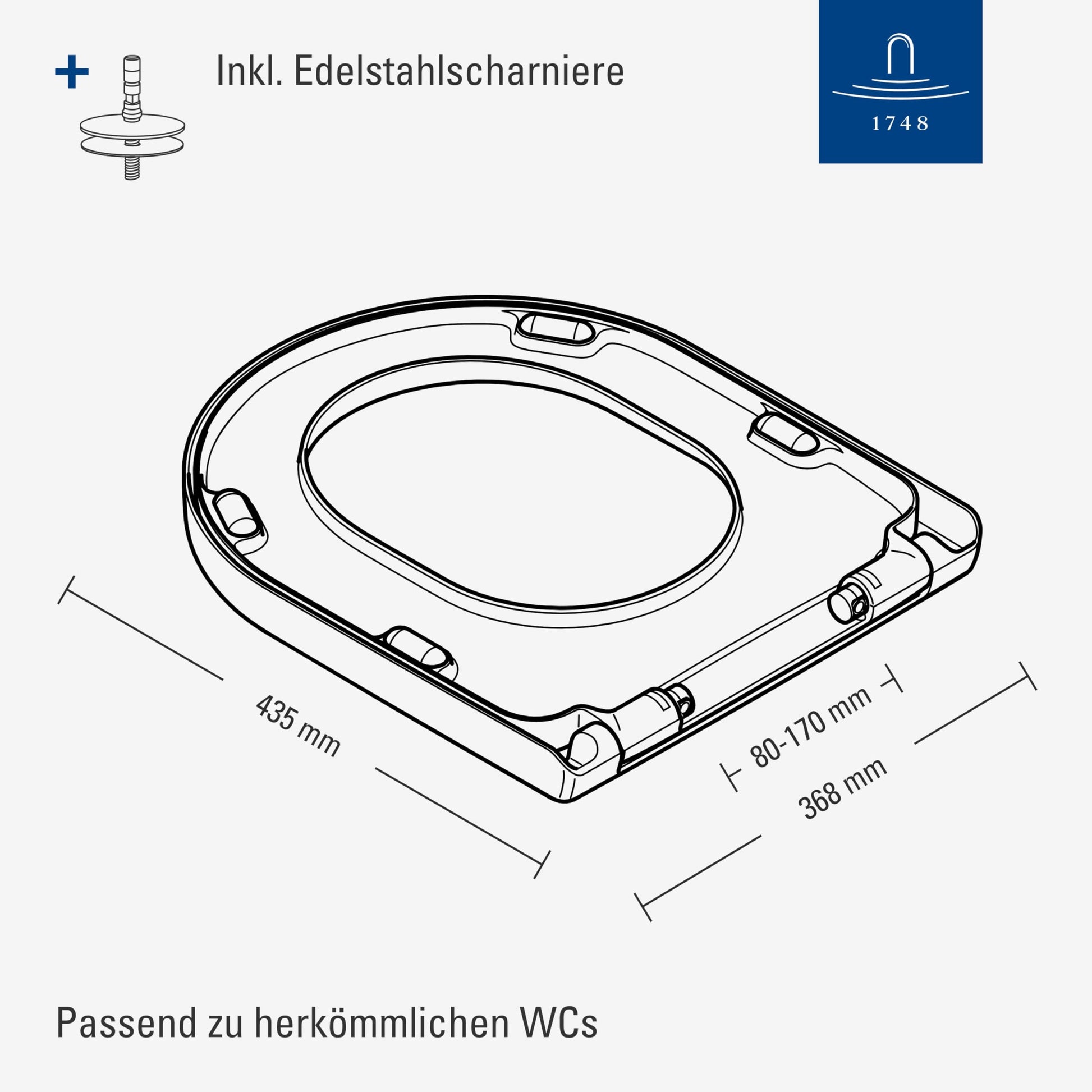 Dieser universelle WC-Sitz ist für die meisten handelsüblichen, ovalen Toiletten konzipiert. Um die Kompatibilität zu prüfen, messen Sie den Abstand zwischen den Befestigungslöchern Ihrer WC-Keramik. Liegt dieser Abstand zwischen 80 und 170 mm, passt der Sitz dank seiner verstellbaren Edelstahlscharniere perfekt.