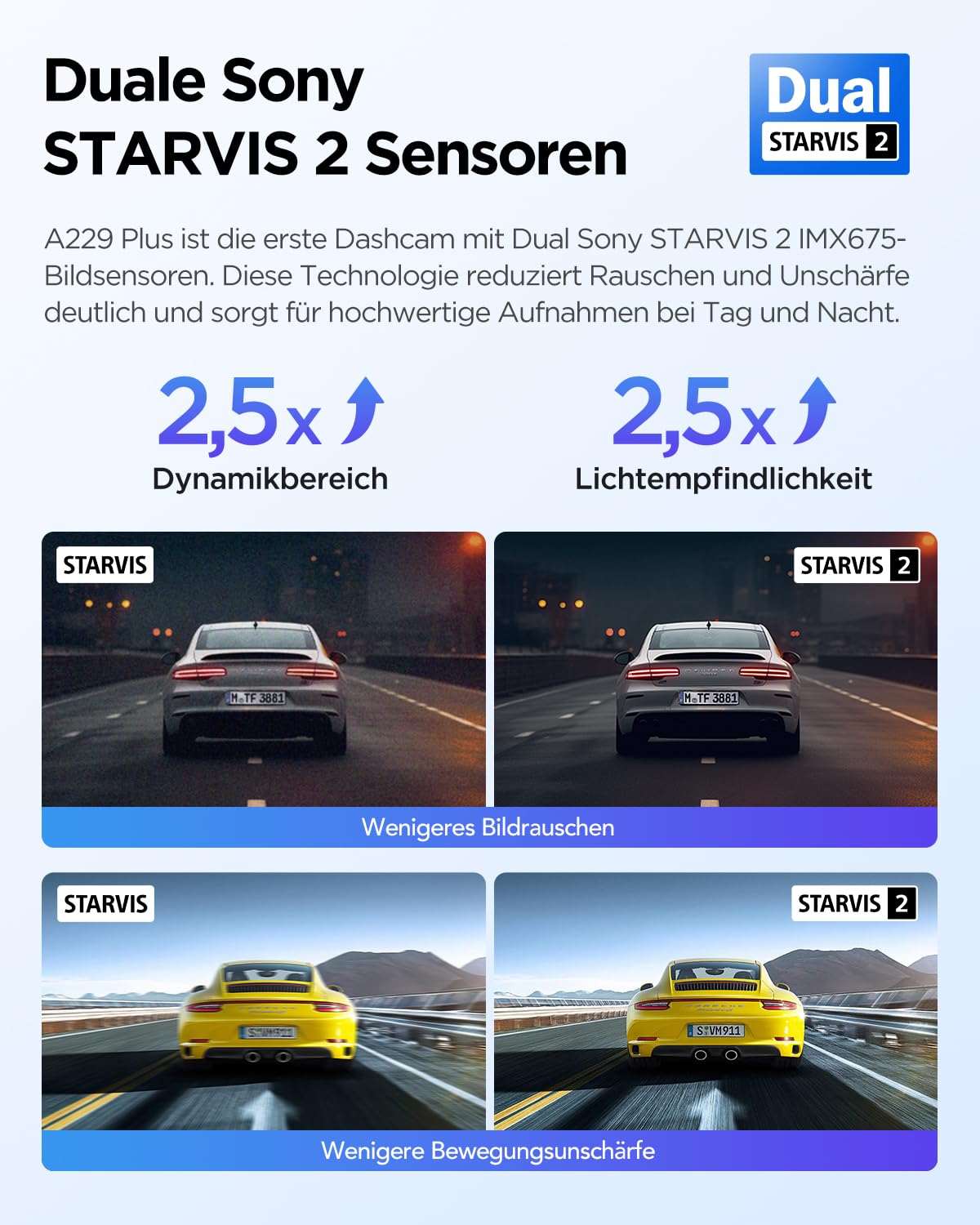 Erleben Sie eine unübertroffene Bildqualität mit der A229 Plus. Die beiden hochmodernen Sony STARVIS 2 Sensoren nehmen das Geschehen vor und hinter Ihrem Fahrzeug in kristallklarer 2K-Auflösung auf. Diese Technologie reduziert Bildrauschen und Bewegungsunschärfe erheblich, was zu beeindruckend detailreichen Videos führt. Gepaart mit der Dual HDR-Technologie balanciert die Kamera helle und dunkle Bereiche perfekt aus, sodass Nummernschilder und andere wichtige Details bei Tag und Nacht, selbst bei schneller Fahrt, zuverlässig erfasst werden.