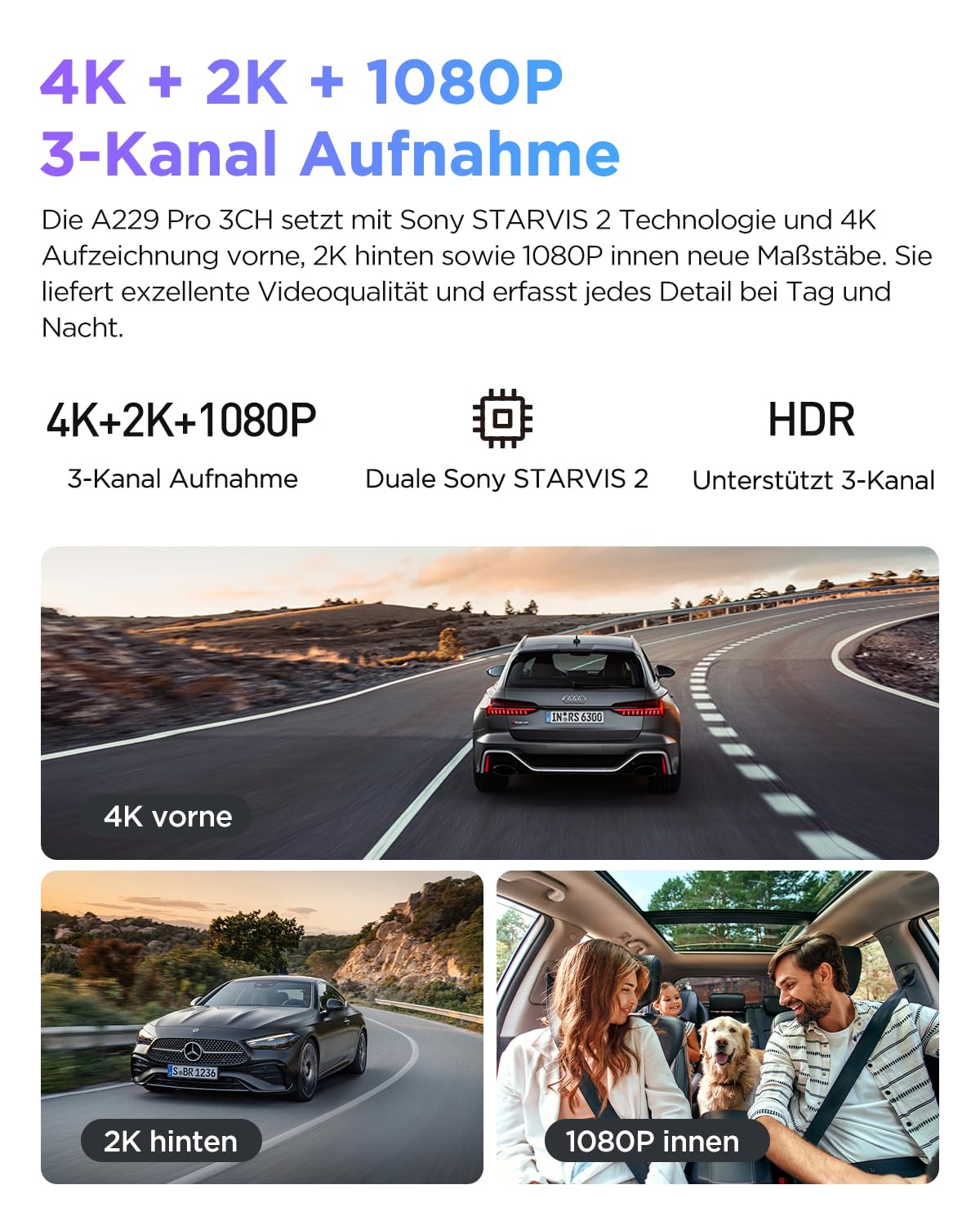 - 3-Kanal-Aufzeichnung in Spitzenqualität: Erfasst die Strasse vorne in 4K, den rückwärtigen Verkehr in 2K und den Innenraum in Full HD (1080p), angetrieben von zwei hochempfindlichen SONY STARVIS 2 Bildsensoren.