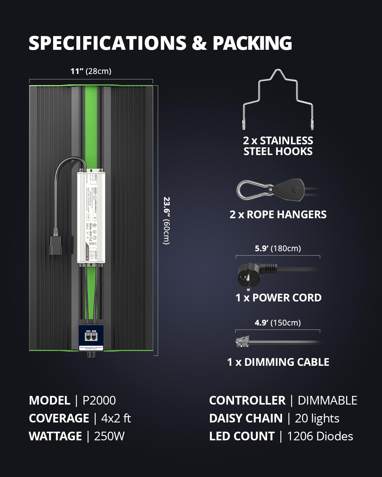 - Daisy-Chain-Funktion: Erlaubt die einfache Verbindung von bis zu 20 P2000-Lampen, ideal für kommerzielle Anwendungen, vertikale Pflanzungen oder grössere Growzelte.
