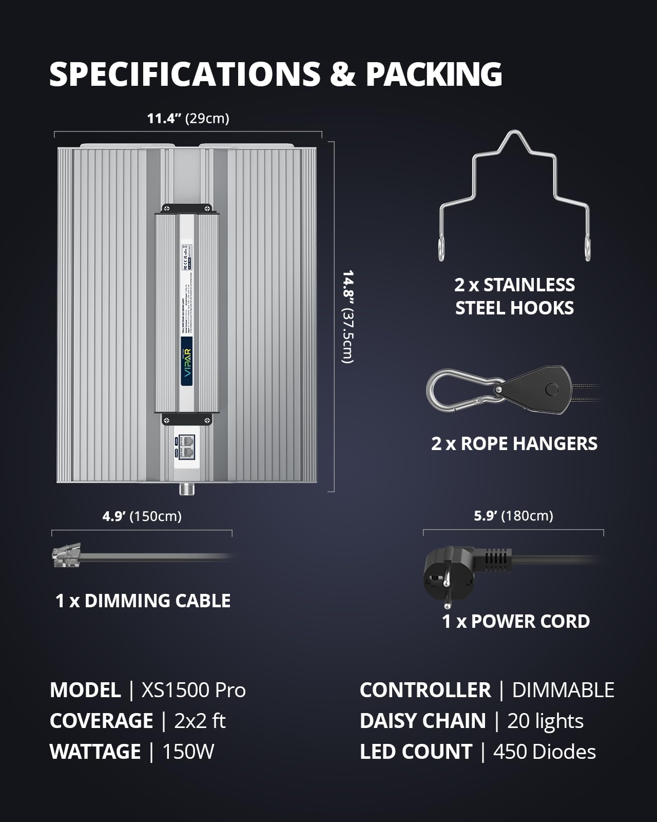 Sie ist sehr effizient. Die XS1500 Pro verbraucht lediglich 150 Watt Strom, bietet aber die Beleuchtungsleistung einer traditionellen 250-Watt-HPS/MH-Lampe. Dies führt zu einer deutlichen Einsparung bei den Betriebskosten.