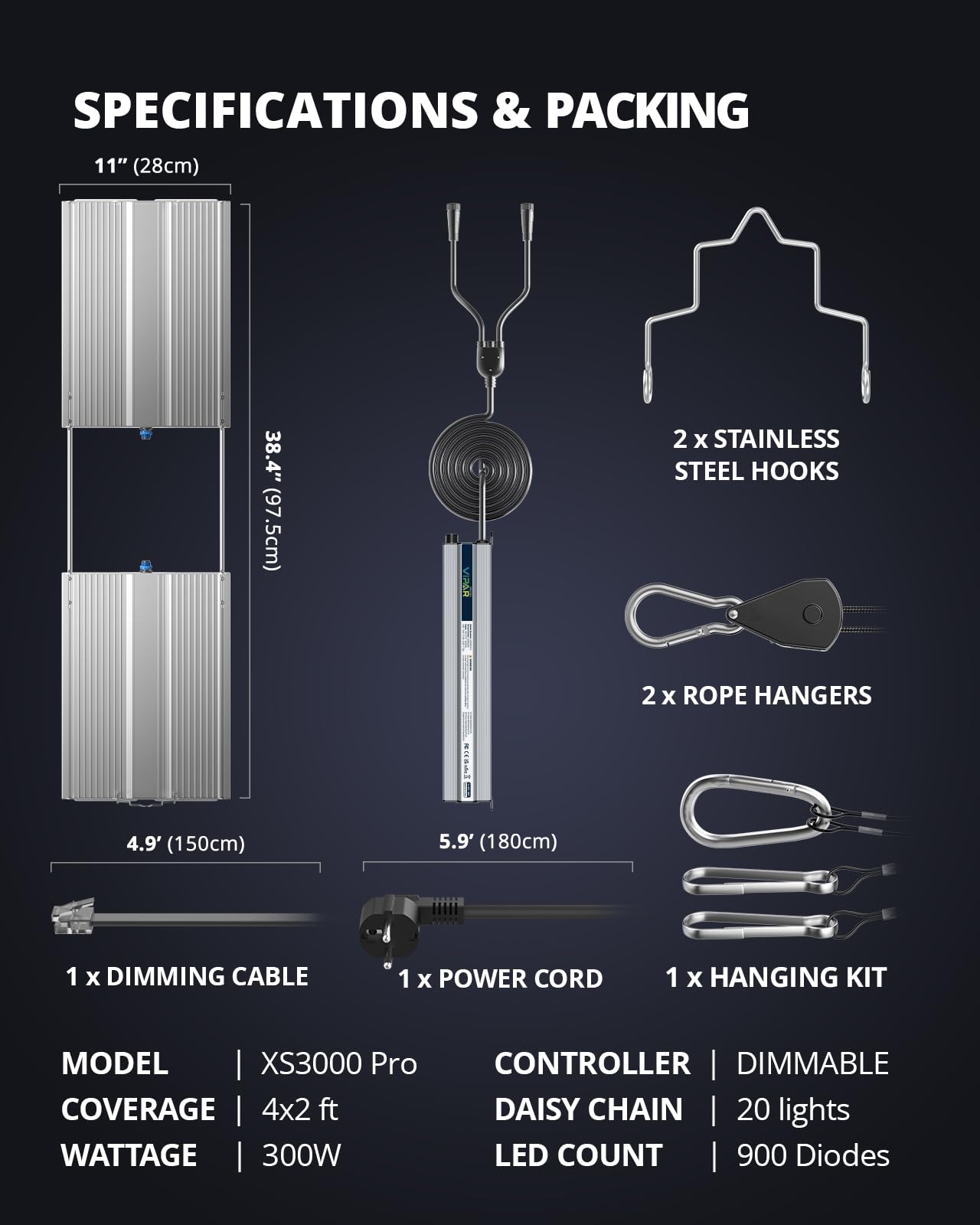 - Empfehlung: Zwei XS3000 Pro Lampen sind perfekt für ein 120 x 120 cm grosses Growzelt.