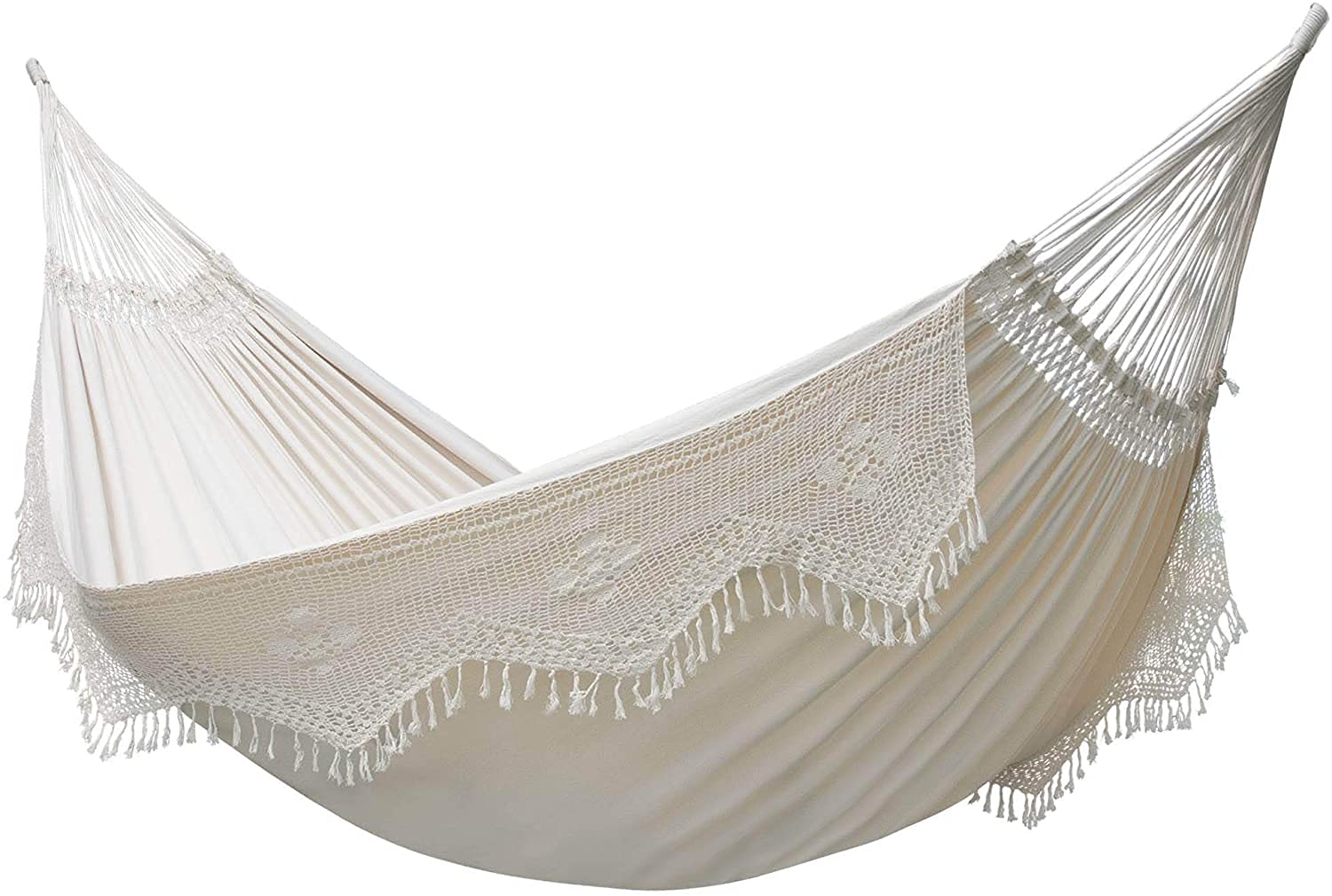 Das einzigartige Design im stilvollen Antique-Look wird durch den kunstvoll von Hand gehäkelten, geflochtenen Rand geprägt. Dieses Detail unterstreicht die authentische brasilianische Herkunft, die hohe Qualität und macht die Hängematte zu einem stilvollen Blickfang in Ihrem Garten oder auf dem Balkon.