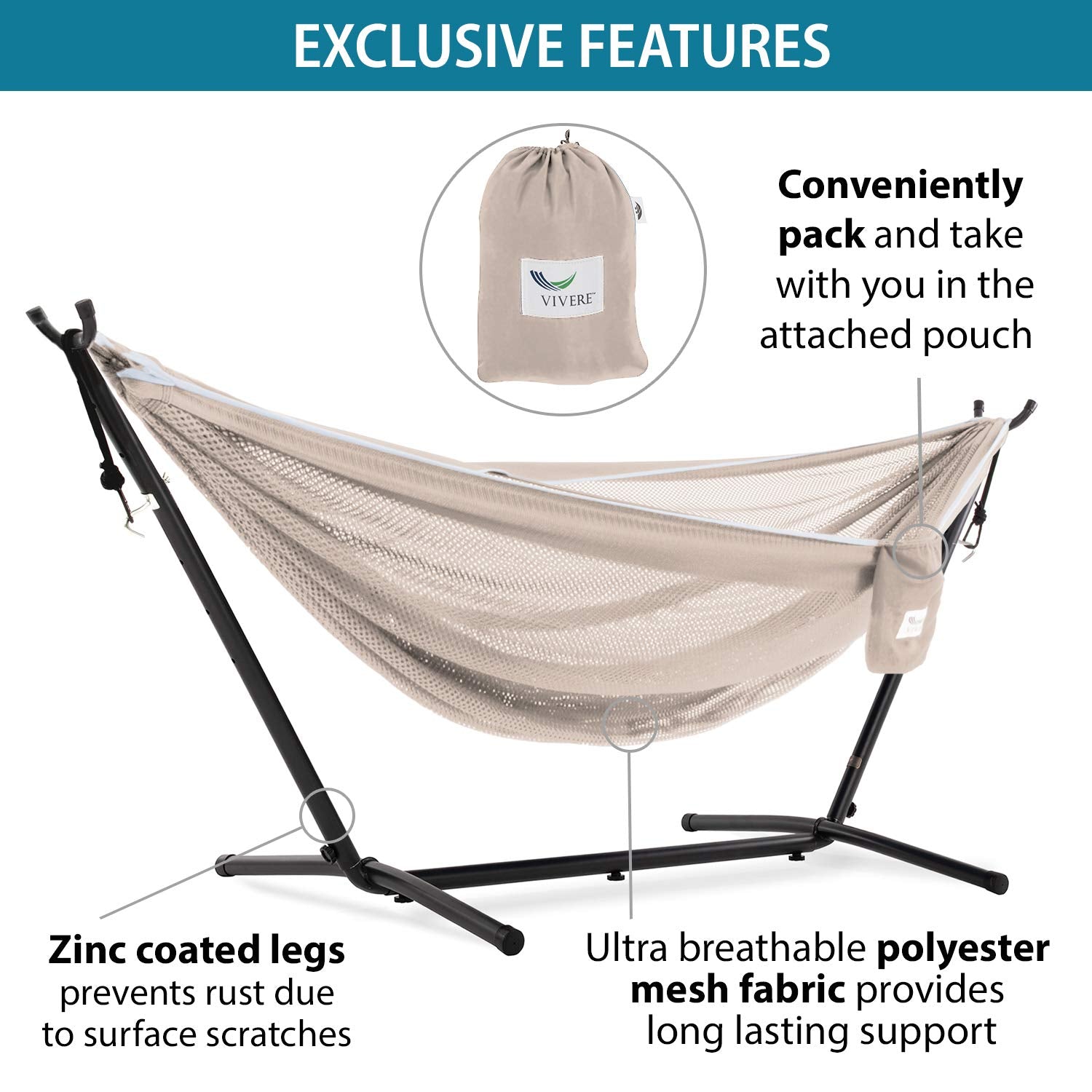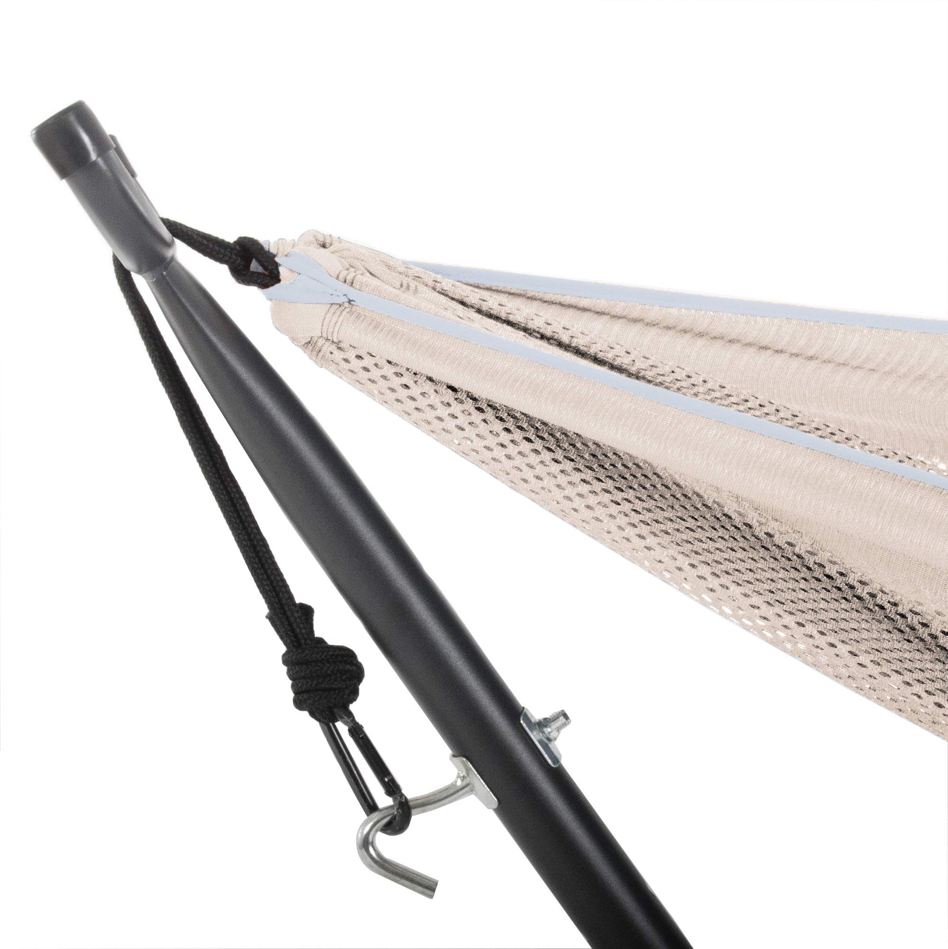 Geniessen Sie pure Entspannung, wo immer Sie möchten, mit dieser leichten und mobilen Mesh-Hängematte inklusive passendem Gestell.