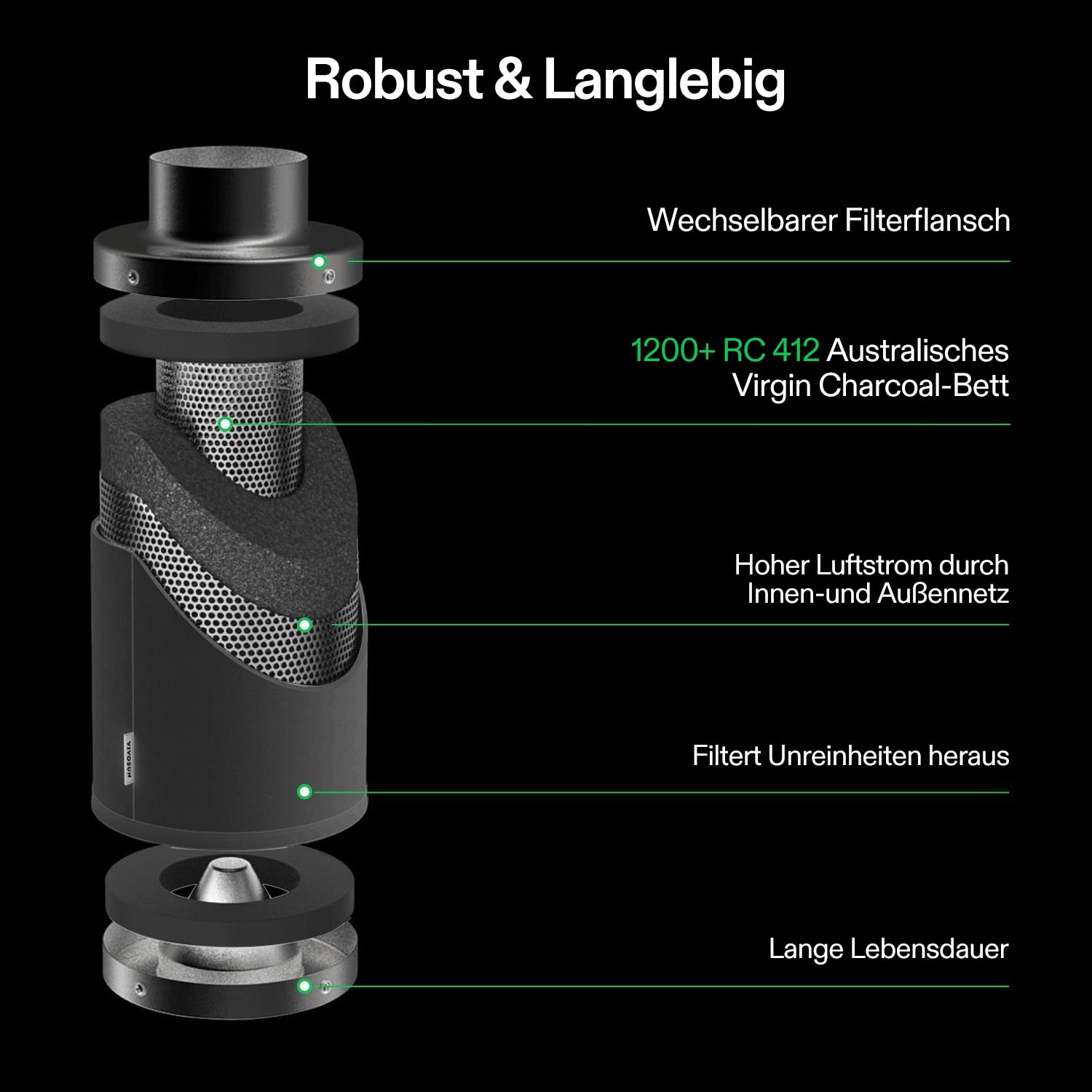 - Effektive Geruchsneutralisation: Der Kohlefilter nutzt hochwertige australische Aktivkohle (RC 412) in einem 38 mm dicken Filterbett, um Gerüche und Chemikalien zuverlässig zu absorbieren. Seilaufhänger für die Montage sind inklusive.