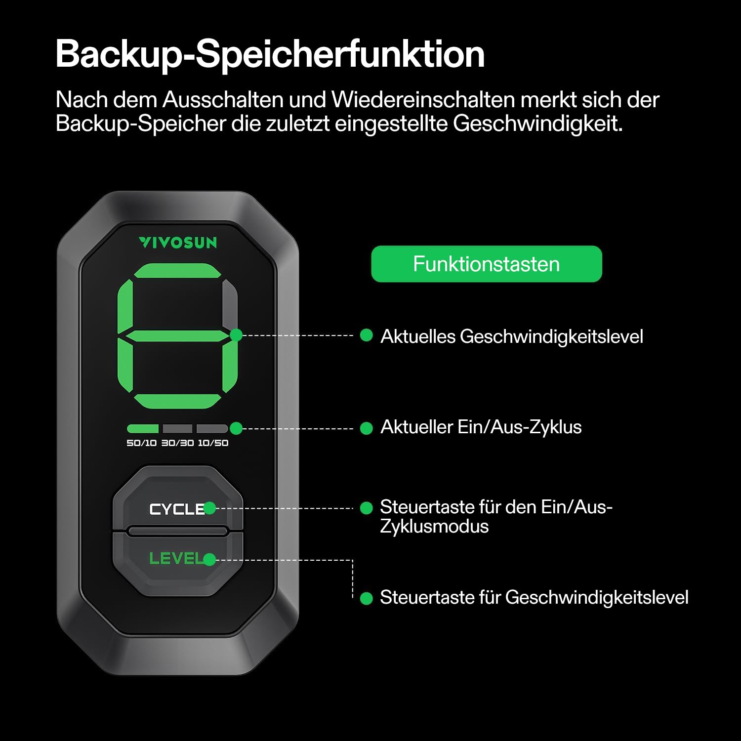 - Intelligente Steuerung: Der E12-Regler bietet 10 Geschwindigkeitsstufen, eine Speicherfunktion für Ihre Einstellungen, Zyklusmodi zur Energieeinsparung und lässt sich für die Fernsteuerung in ein App-System integrieren.
