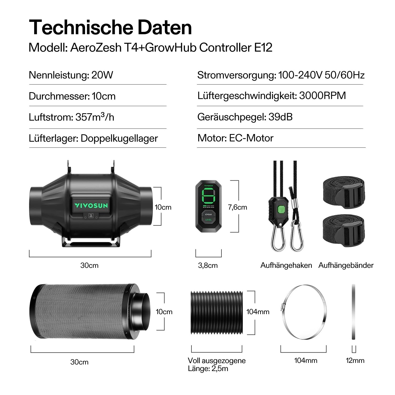 - Umfassendes Komplettset: Beinhaltet einen 100mm Rohrventilator (AeroZesh T4), einen intelligenten E12-Geschwindigkeitsregler, einen Aktivkohlefilter sowie einen 240cm langen Luftkanal.