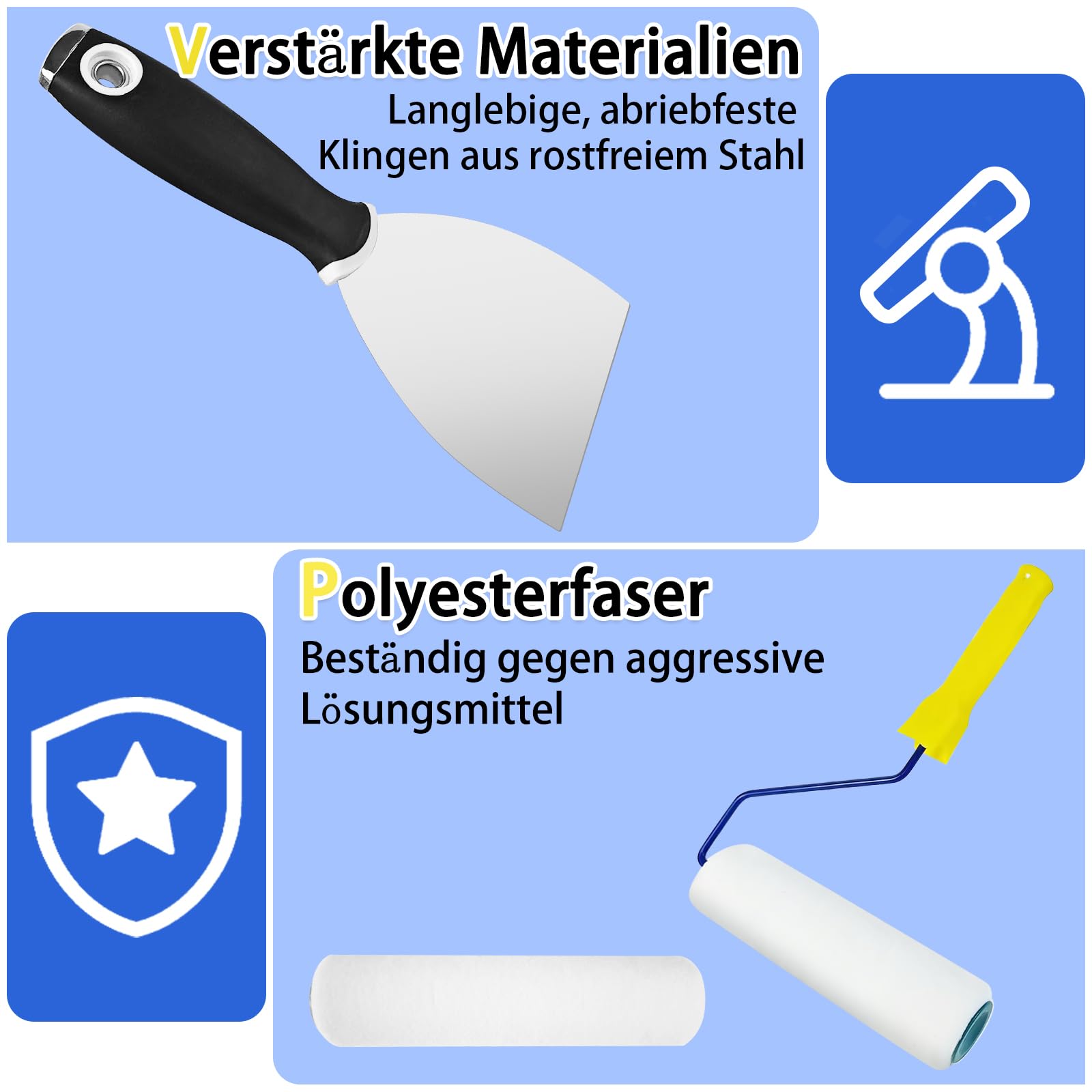 - Farbroller & Spachtel: Beinhaltet zwei 30 cm breite, hochdichte Schaumstoffrollen für den gleichmässigen Grundierungsauftrag sowie einen 10 cm breiten Spachtel mit Edelstahlklinge zur Vorbereitung des Untergrunds.
