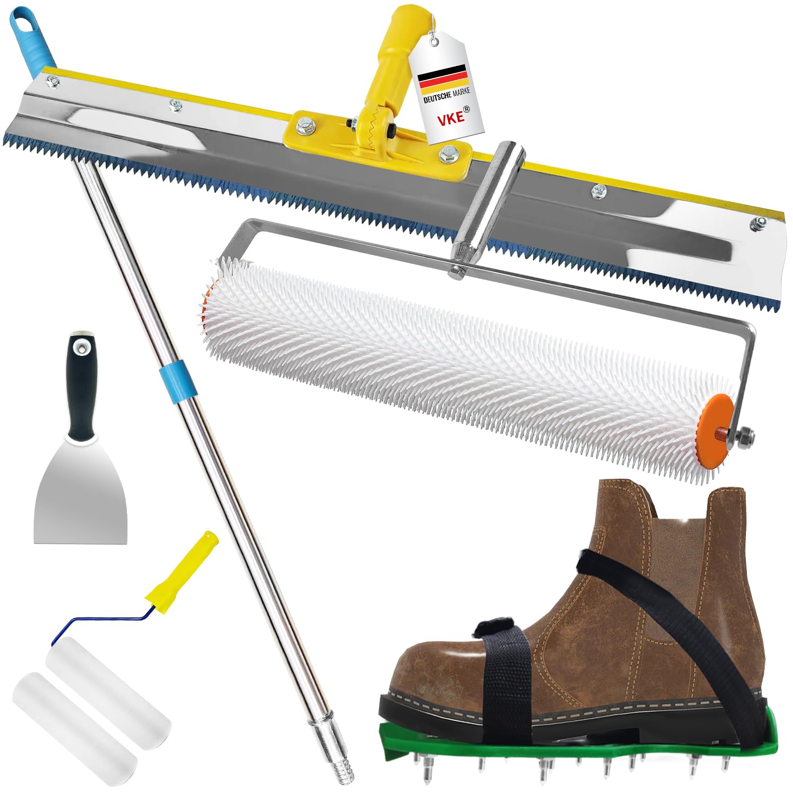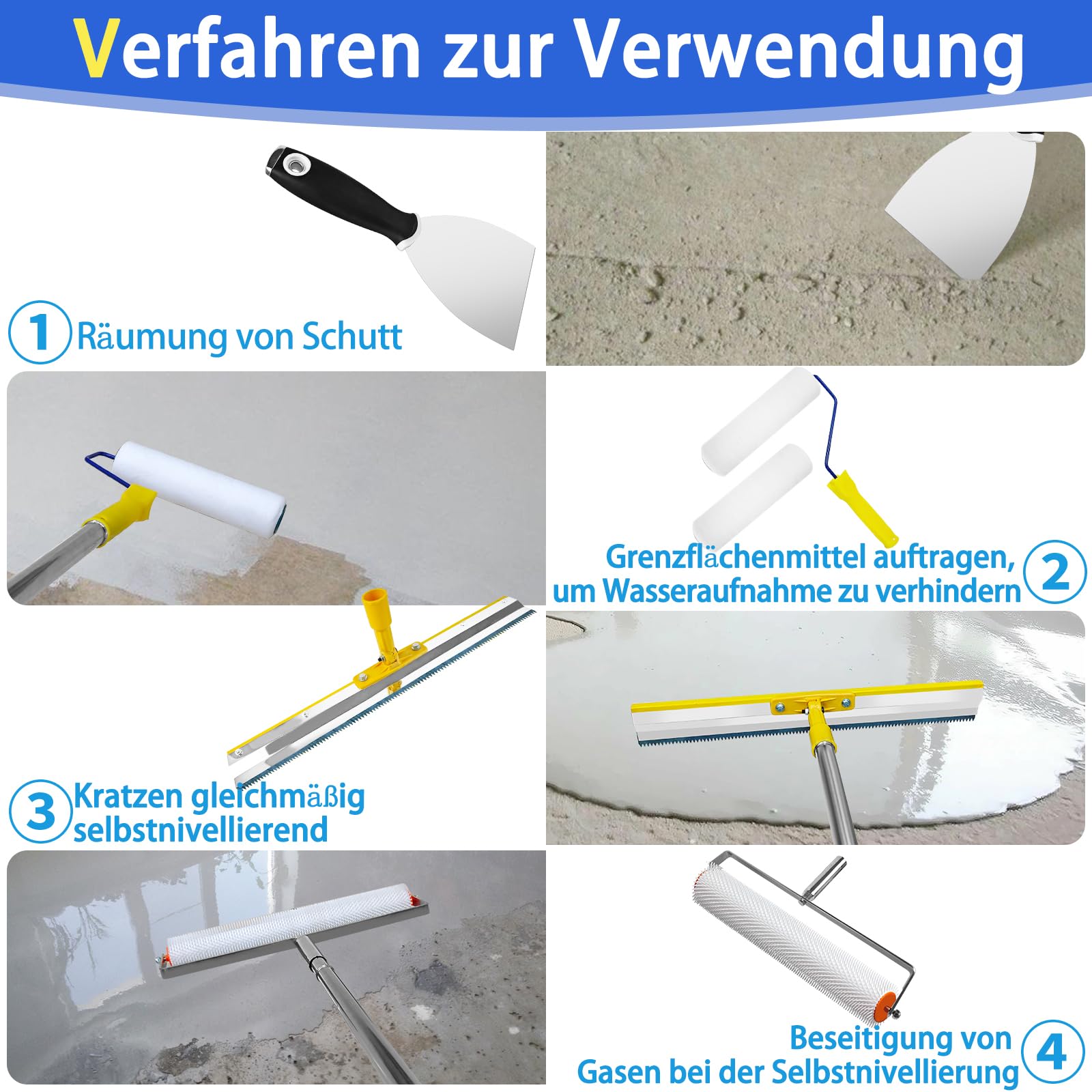 Dieses Set ist ideal für die professionelle Verarbeitung von Bodenbeschichtungen wie Ausgleichsmassen und Epoxidharz. Es eignet sich perfekt zur Untergrundvorbereitung, zum Grundieren, zum gleichmässigen Verteilen der Masse und zum Entlüften für ein makelloses Ergebnis.