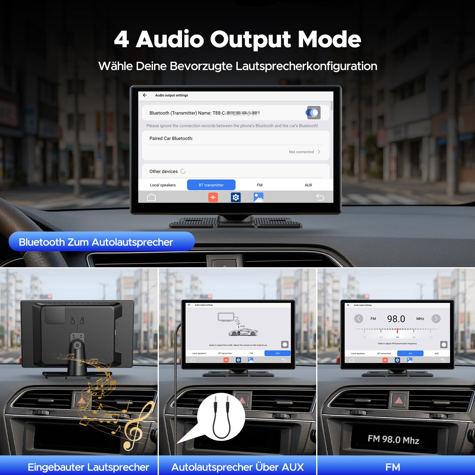 Sie haben mehrere flexible Möglichkeiten: Nutzen Sie den eingebauten FM-Transmitter, um den Ton drahtlos an Ihr Autoradio zu senden, verbinden Sie Ihr Auto über das mitgelieferte AUX-Kabel, nutzen Sie eine Bluetooth-Verbindung zu Ihrem Fahrzeugsystem oder verwenden Sie den integrierten Lautsprecher des Geräts.