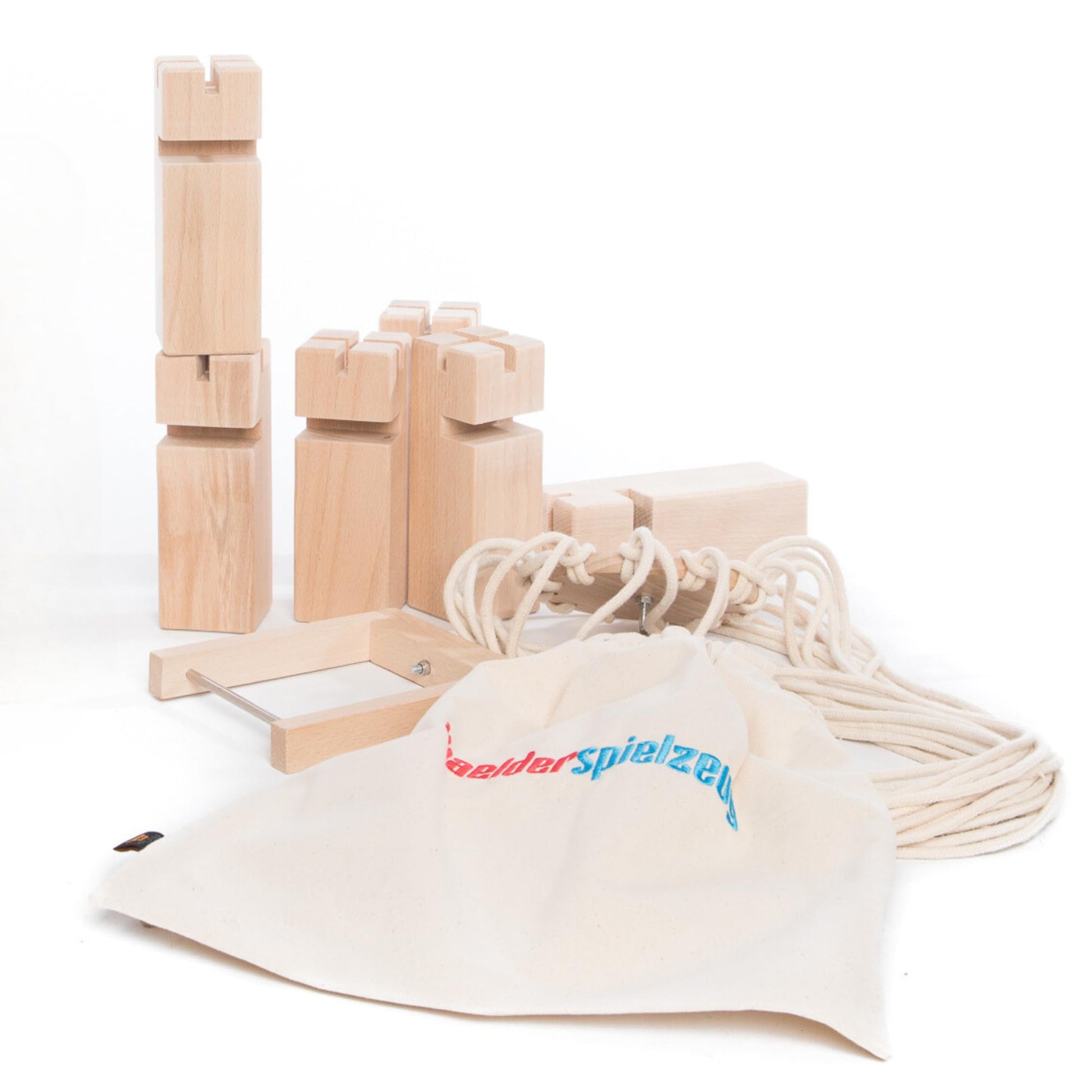 Das komplette Set beinhaltet 6 massive Klötze aus Buchenholz (wahlweise naturbelassen oder mehrfarbig), 1 stabilen Greifbügel aus Metall, 1 Holzteller mit 12 Bohrungen sowie 12 hochwertige Seile mit je 4 Metern Länge. Ein praktischer Transportbeutel ist optional erhältlich.