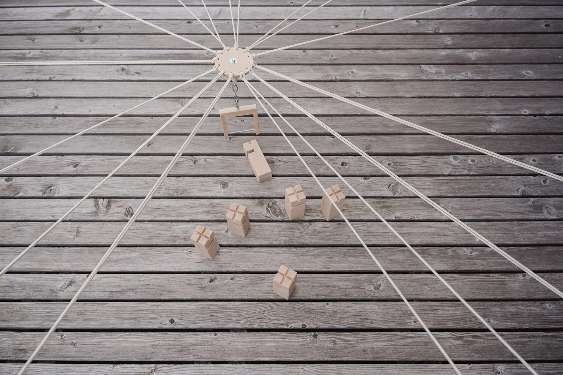 Jeder Mitspieler hält eines der 12 Seile, die an einem Greifbügel befestigt sind. Durch präzise Abstimmung und gemeinsame Bewegungen muss die Gruppe den Bügel steuern, um die Holzklötze zu greifen und einen Turm zu errichten, ohne dass er umfällt.