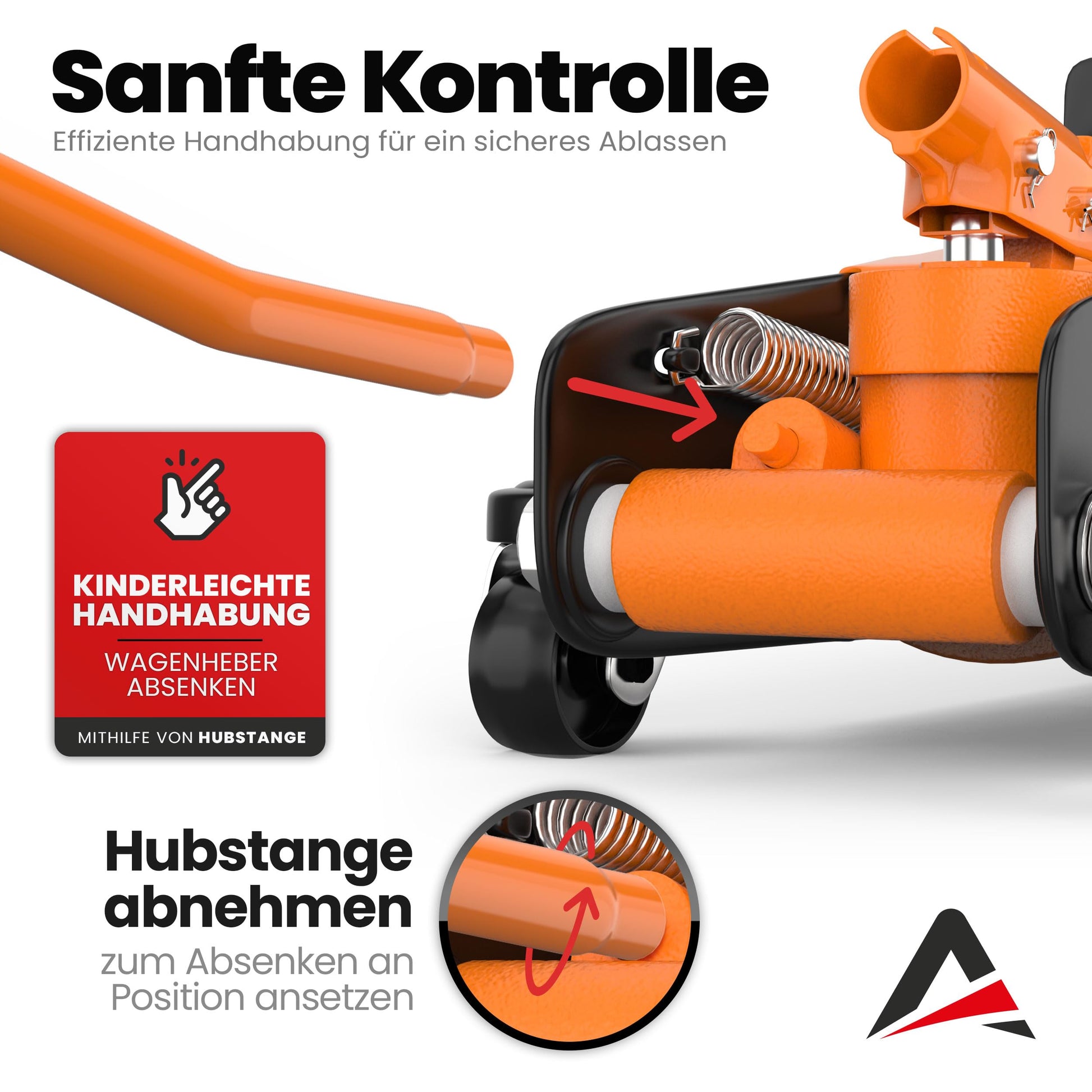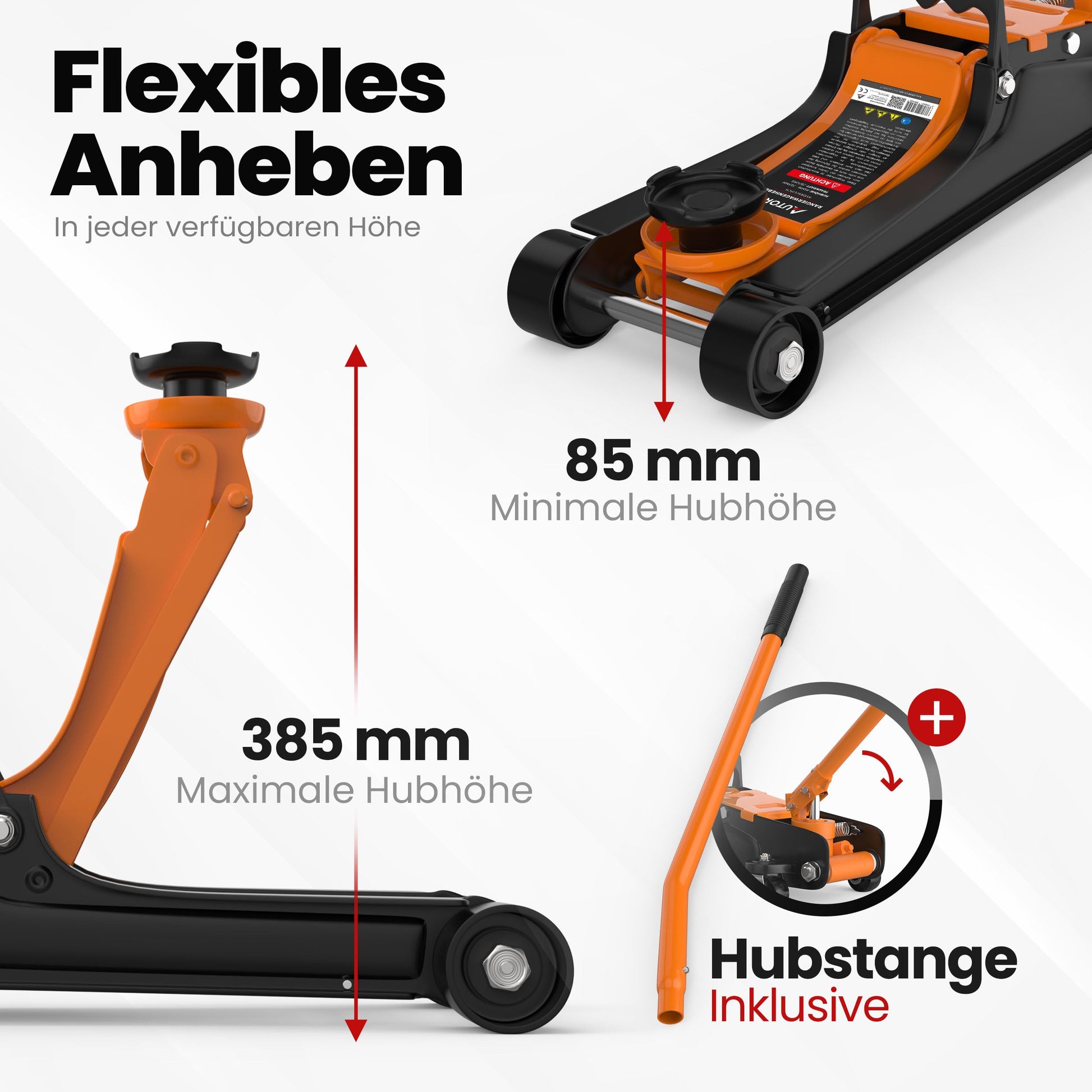 Der Wagenheber hat einen Hubbereich von einer minimalen Unterfahrhöhe von 85 mm bis zu einer maximalen Höhe von 385 mm. Dank des effizienten Hydraulik-Systems und des langen Pumphebels können Sie Ihr Fahrzeug mit geringem Kraftaufwand komfortabel anheben.