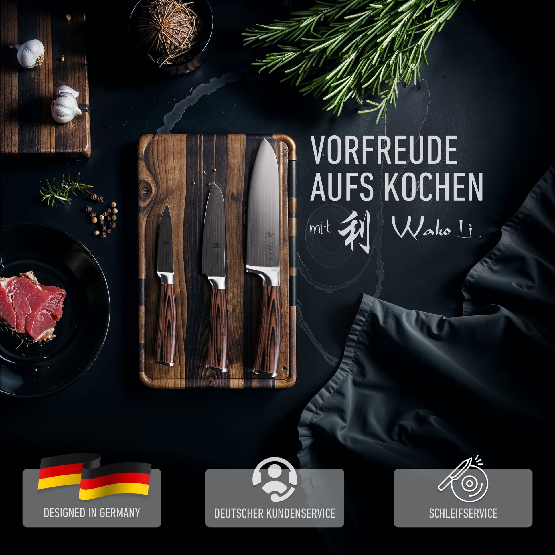 Neben der herausragenden Funktionalität überzeugen die Messer durch ihr zeitloses Design. Die ergonomisch geformten Pakkaholzgriffe liegen nicht nur angenehm und sicher in der Hand, sondern machen das Set auch zu einem ästhetischen Blickfang in Ihrer Küche.