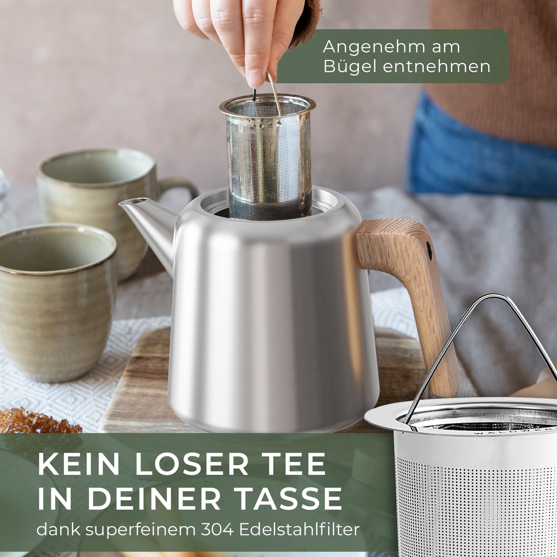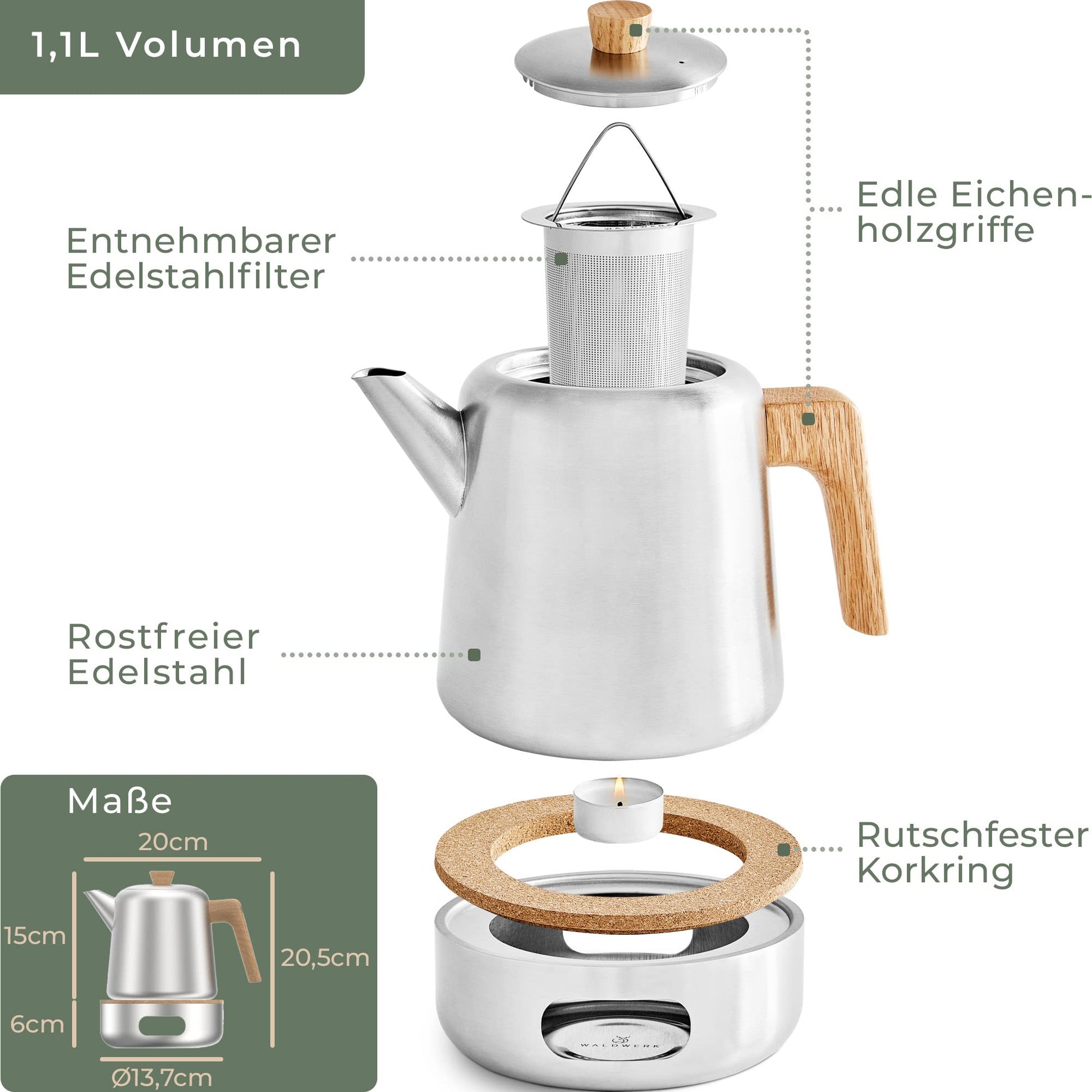 WALDWERK Teekanne mit Stövchen, Edelstahl, Sieb, 1.1L Eiche