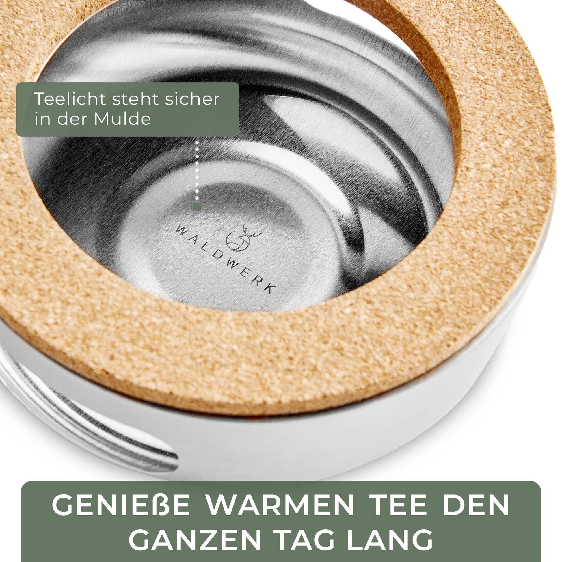 Das Set enthält ein passendes Stövchen aus Edelstahl. Mit einem handelsüblichen Teelicht hält es Ihren Tee zuverlässig über mehrere Stunden auf einer angenehmen Trinktemperatur – ideal für gemütliche Nachmittage oder lange Abende.