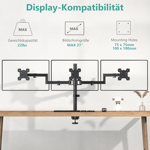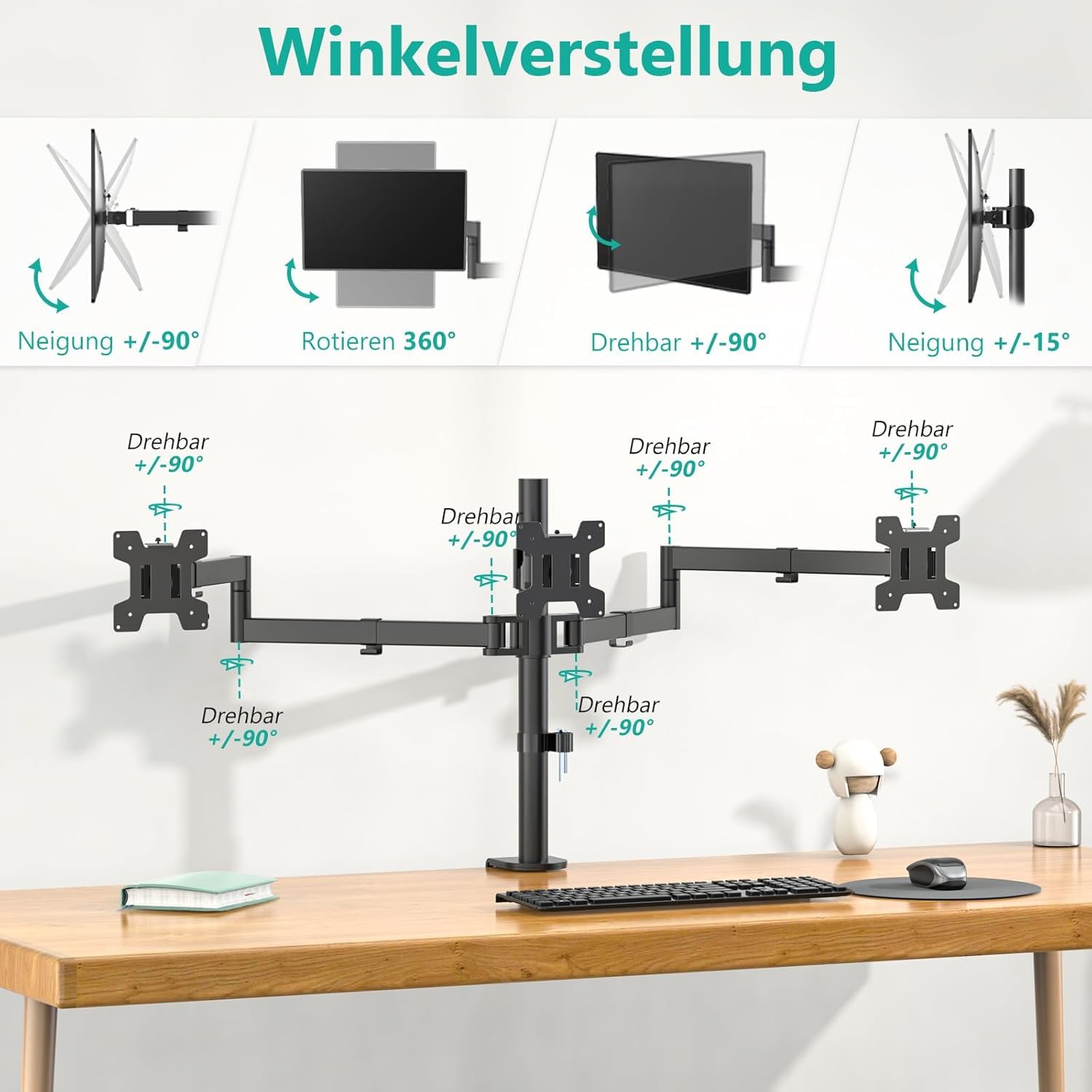Optimieren Sie Ihren Arbeitsplatz mit dieser robusten Halterung für drei Monitore. Sie ermöglicht eine flexible und ergonomische Anordnung Ihrer Bildschirme für maximale Produktivität und Komfort bei der Arbeit oder in der Freizeit.