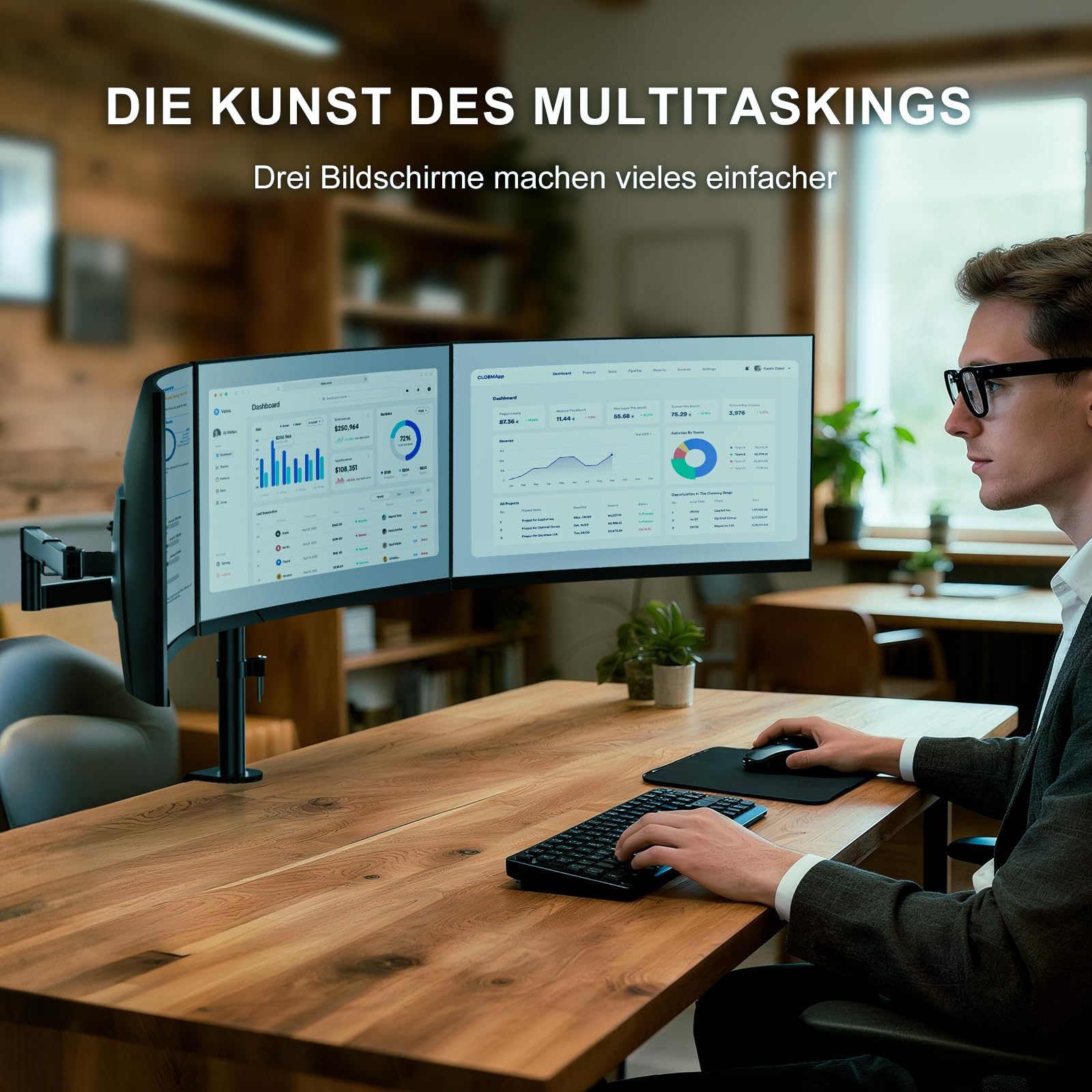 Steigern Sie Ihre Effizienz: Mit einer nahtlosen Anordnung von drei Monitoren behalten Sie stets den Überblick und steigern Ihre Produktivität deutlich. Die Halterung schafft zudem wertvollen Platz auf Ihrem Schreibtisch und sorgt für eine aufgeräumte, professionelle Optik.