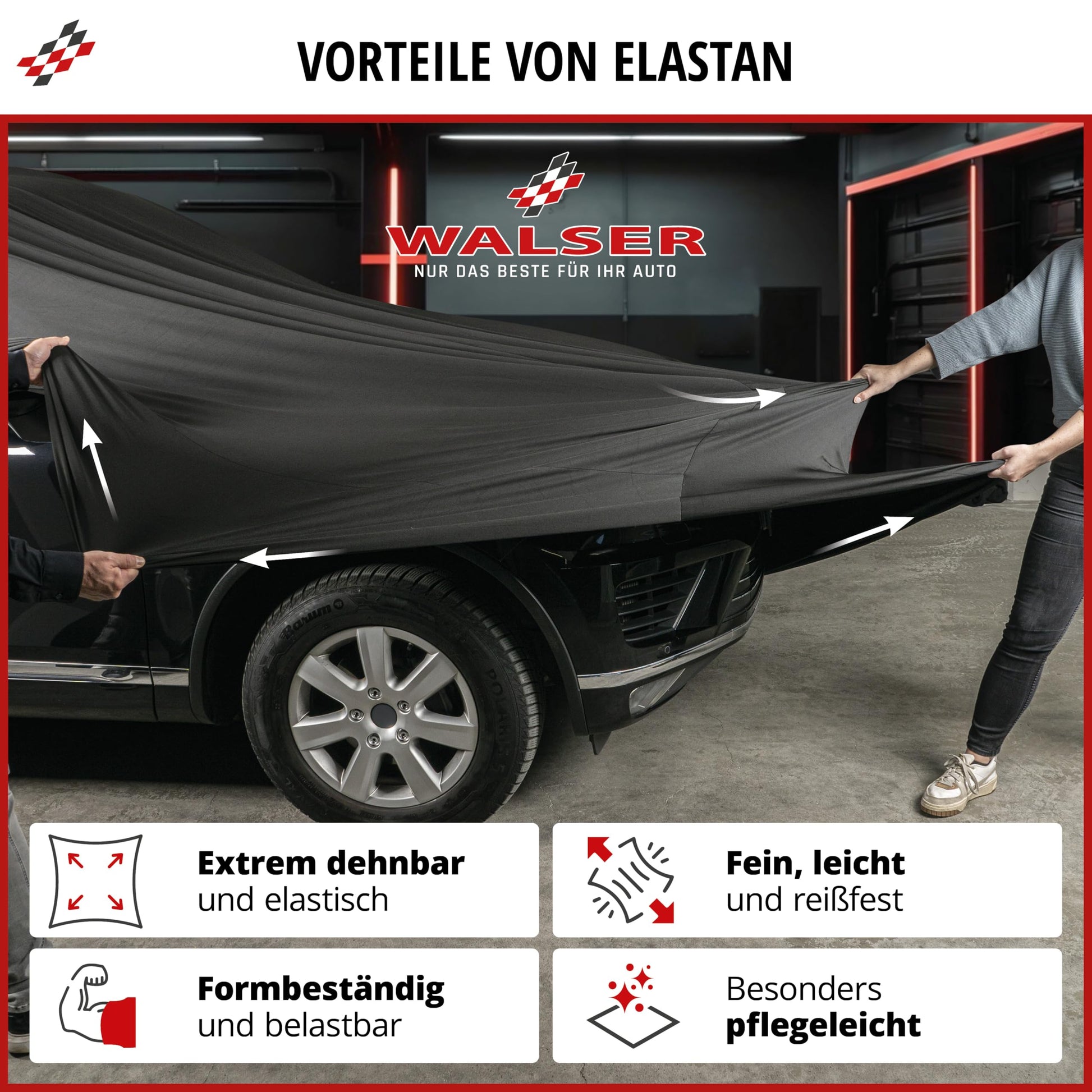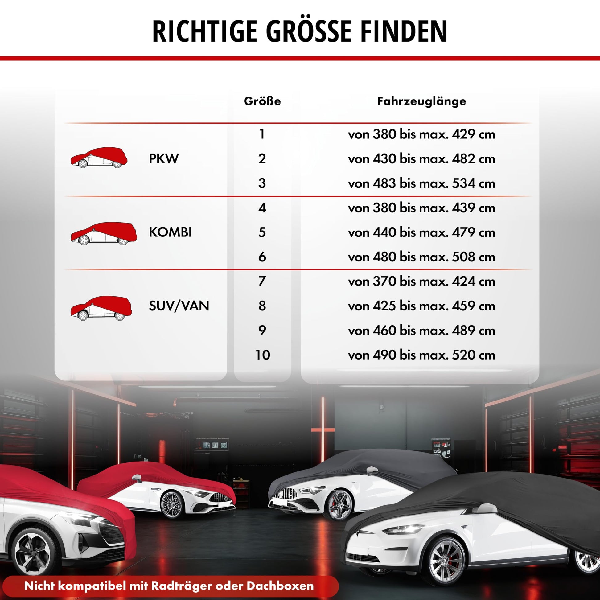 - Perfekte Passform: Dank hochelastischem Stretch-Material und der Verfügbarkeit in 10 verschiedenen Grössen schmiegt sich die Plane wie eine zweite Haut an Ihr Fahrzeug an.