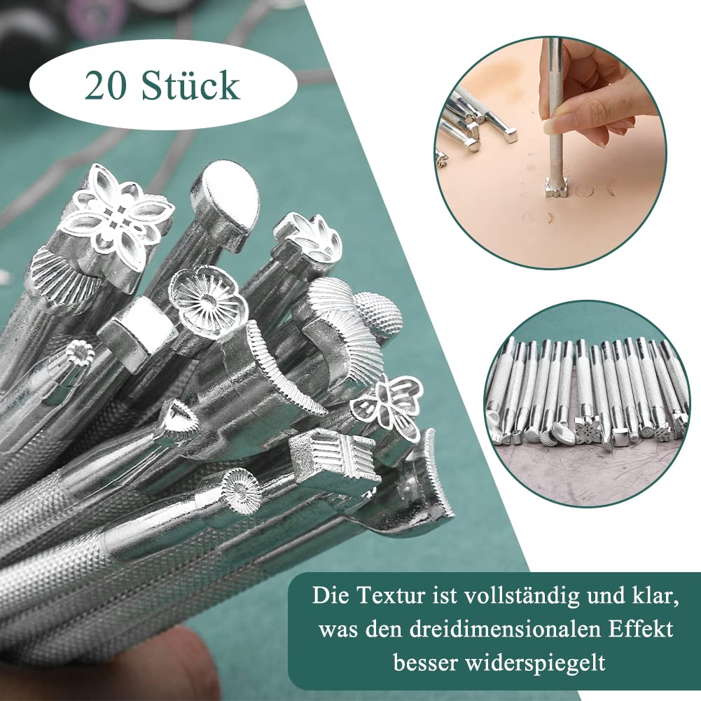 - Kreatives Schnitz- und Präge-Set: Enthält 20 verschiedene Prägestempel, ein professionelles Drehmesser, Kantenabschräger und Polierhölzer für die Umsetzung individueller und kunstvoller Designs auf Leder.