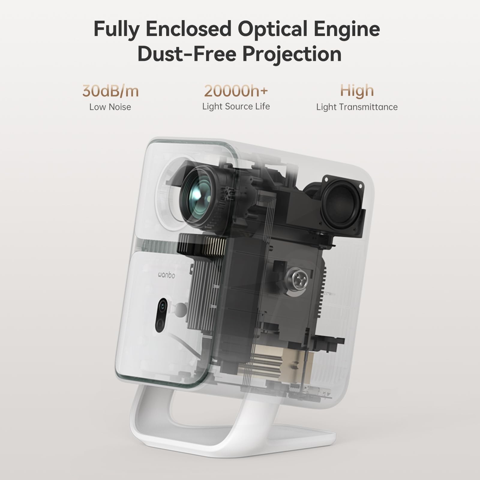 Dank des einzigartigen, um 120° schwenkbaren Standfusses können Sie das Bild mühelos an die Wand, die Decke oder eine andere Fläche projizieren. Die gekapselte optische Einheit verhindert das Eindringen von Staub, was die Bildung von unschönen schwarzen Flecken auf dem Bild unterbindet und eine lange Lebensdauer des Geräts sicherstellt.