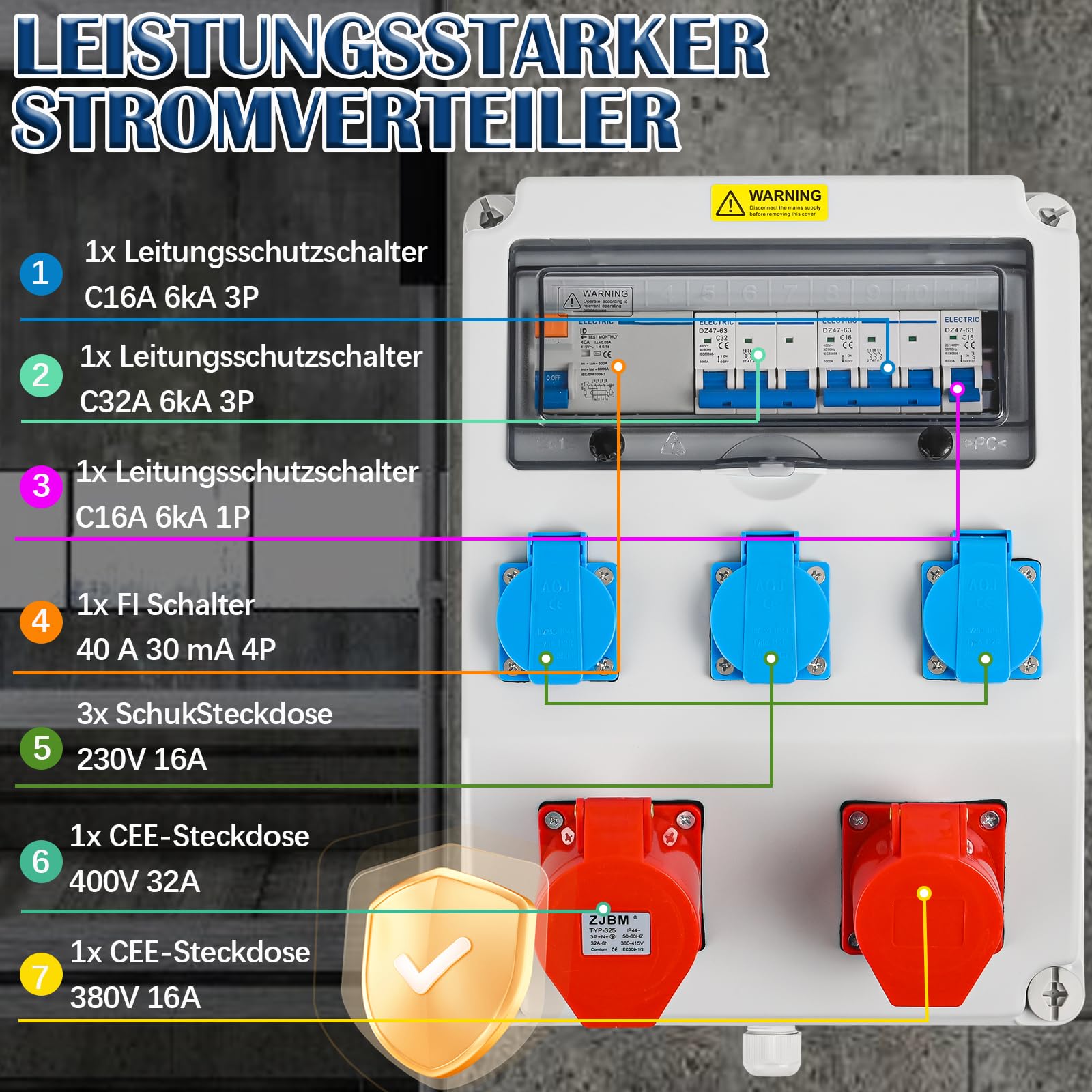 - Vielseitige Anschlüsse: Ausgestattet mit drei 230V Schuko-Steckdosen sowie je einer CEE 16A und CEE 32A Starkstromsteckdose für flexible Anwendungen.