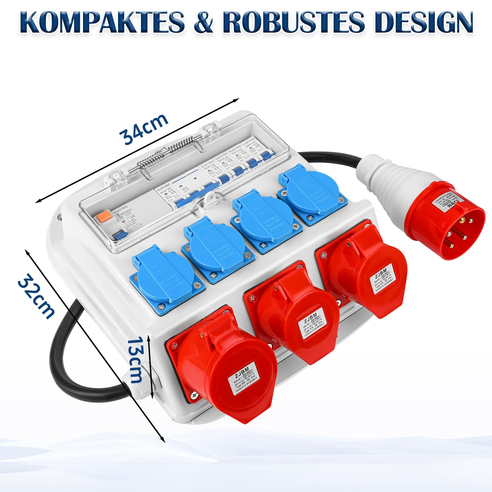 - Anschlussvielfalt: Ausgestattet mit vier 230V Schuko-Steckdosen, zwei 5-poligen CEE 16A Steckdosen und einer 5-poligen CEE 32A Steckdose.