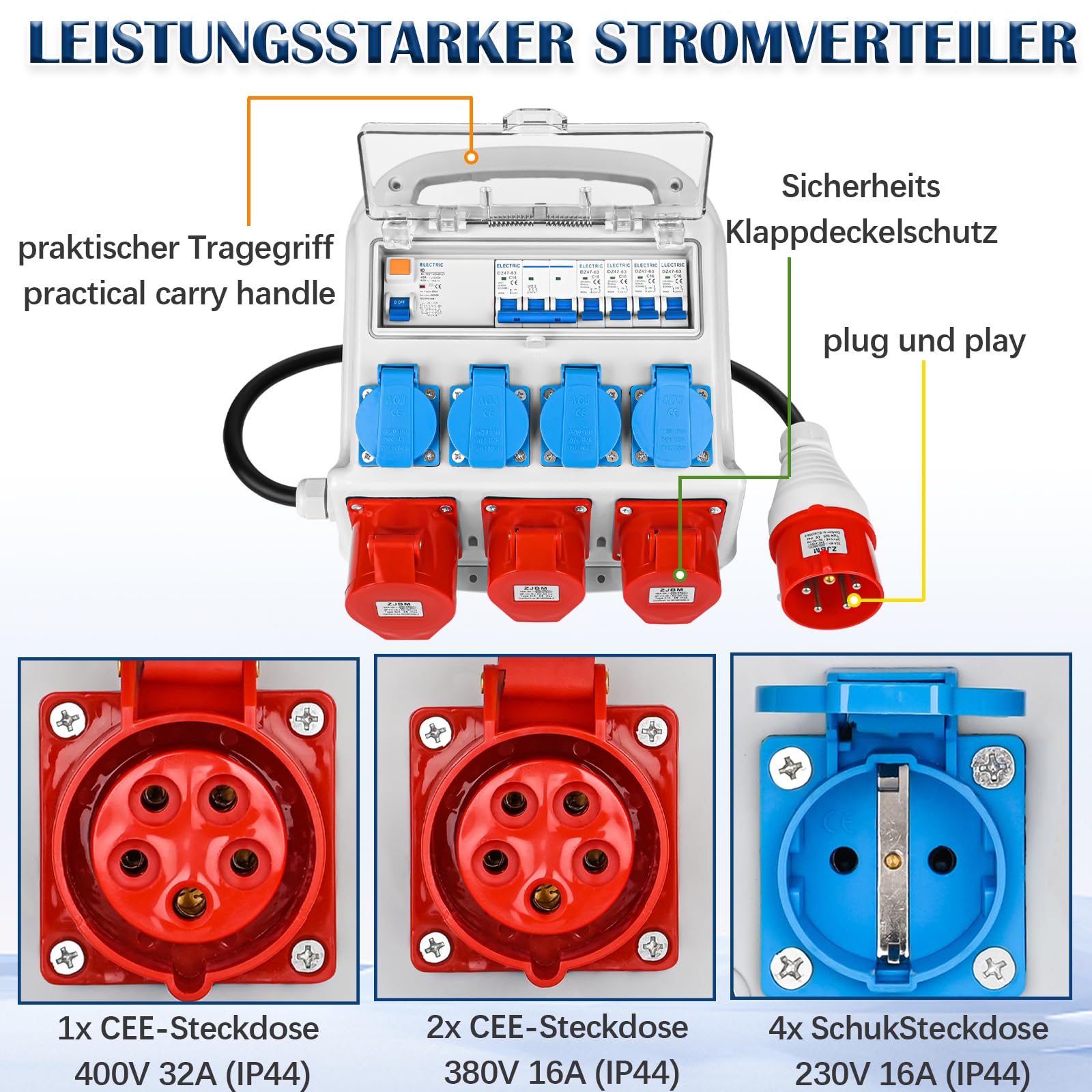 Der Verteiler bietet eine vielseitige Anschlussvielfalt: vier 230V Schuko-Steckdosen, zwei 5-polige 400V CEE 16A Steckdosen und eine 5-polige 400V CEE 32A Steckdose.