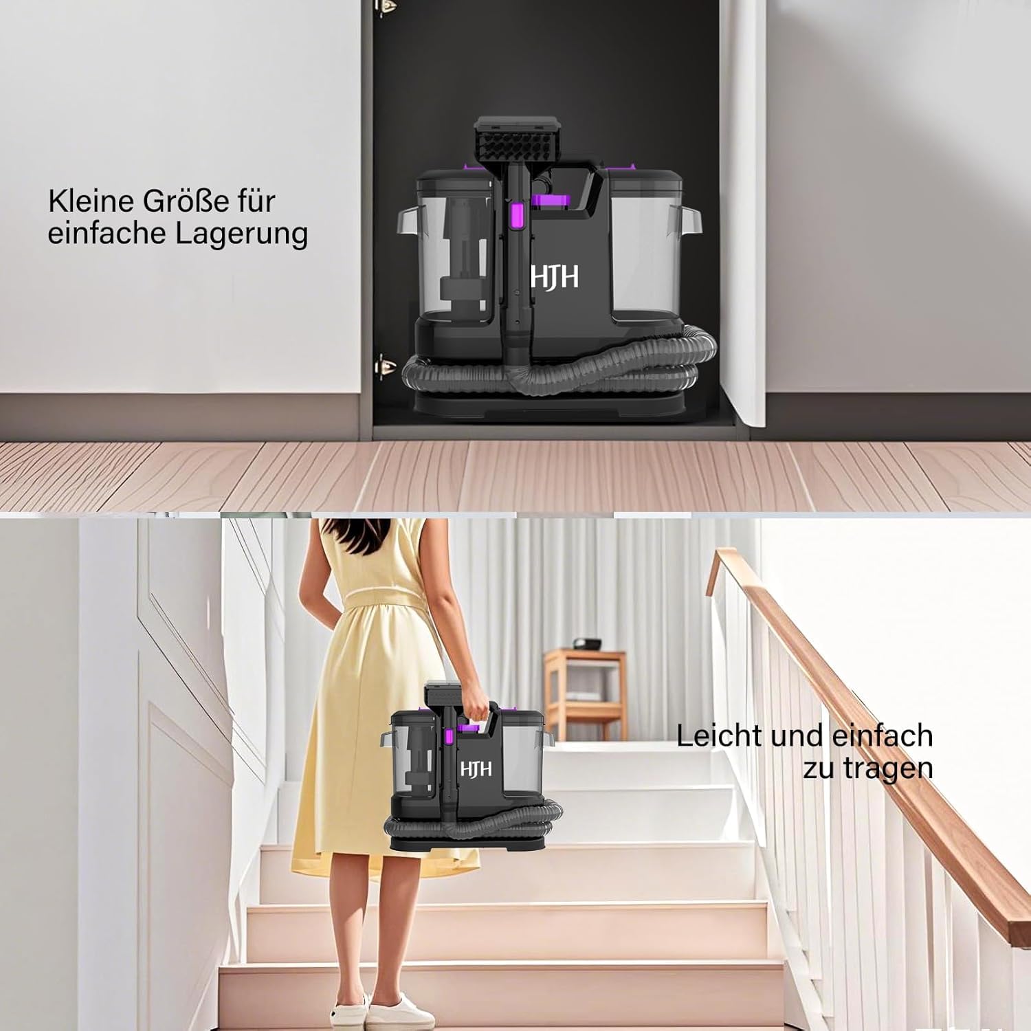 Erleben Sie eine professionelle Fleckenentfernung auf Knopfdruck. Die fortschrittliche Reinigungstechnologie kombiniert das Aufsprühen von Wasser (mit Ihrem bevorzugten Reinigungsmittel), das Schrubben der Oberfläche und das kraftvolle Absaugen des Schmutzwassers in einem effizienten Schritt. Ob verschüttete Getränke, Spuren von Haustieren oder alltäglicher Schmutz – dieses Gerät stellt die ursprüngliche Frische Ihrer Textilien wieder her.