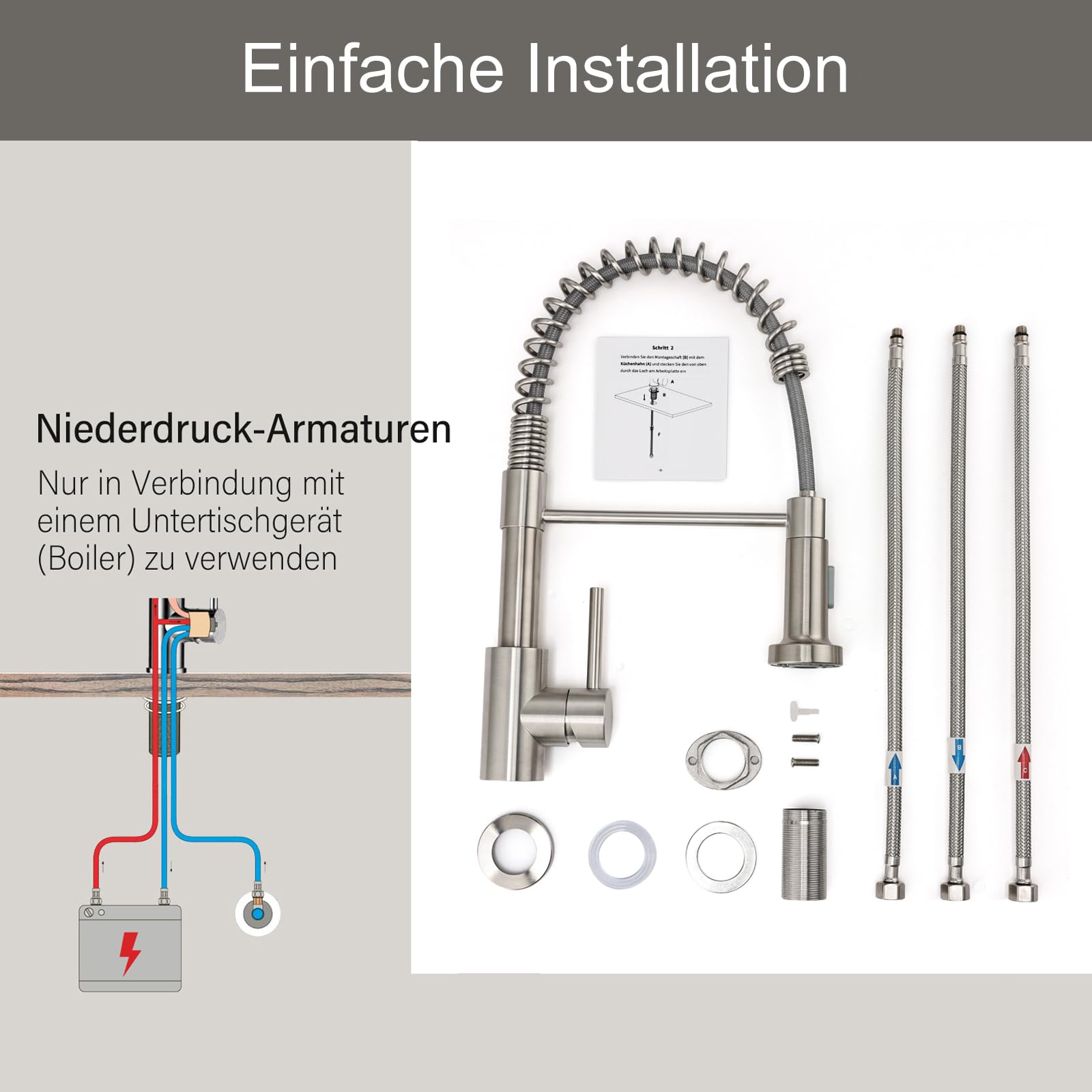 - Für Niederdrucksysteme: Ausschliesslich für den Betrieb mit Boilern/Untertischgeräten konzipiert; inklusive drei DVGW-zertifizierter Anschlussschläuche (G 3/8).