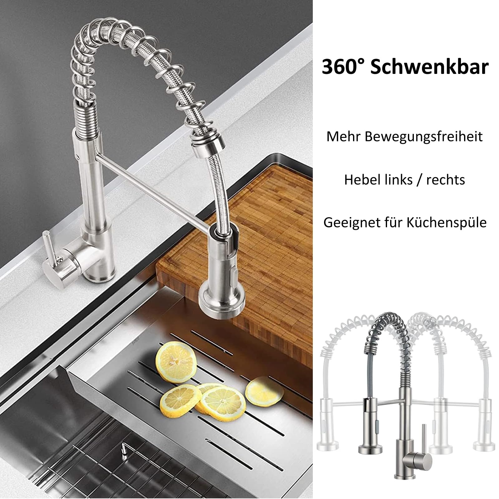 - Maximale Flexibilität: Der Auslauf ist um 360° schwenkbar und die ausziehbare Geschirrbrause mit Spiralfeder ermöglicht es, jeden Winkel des Spülbeckens mühelos zu erreichen.