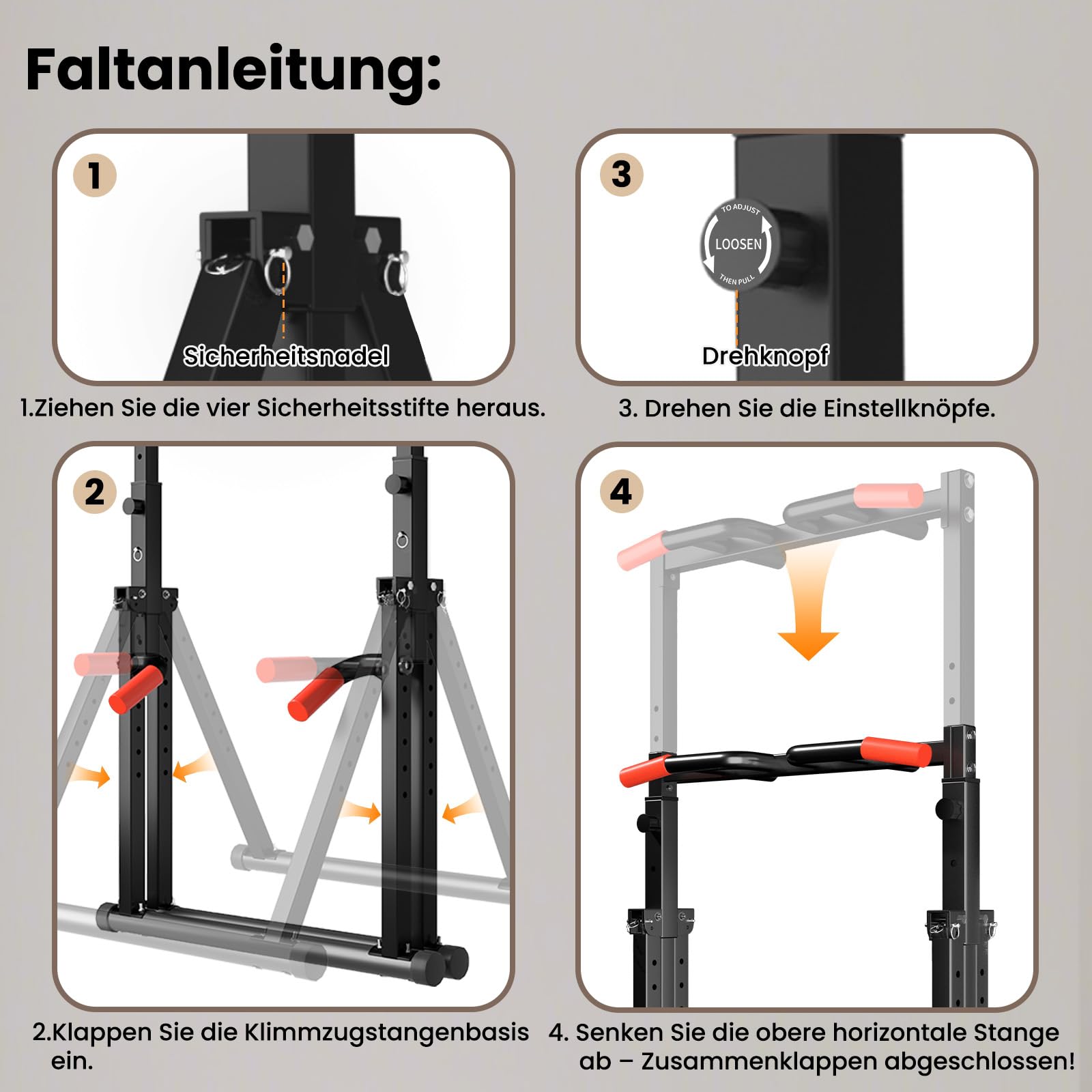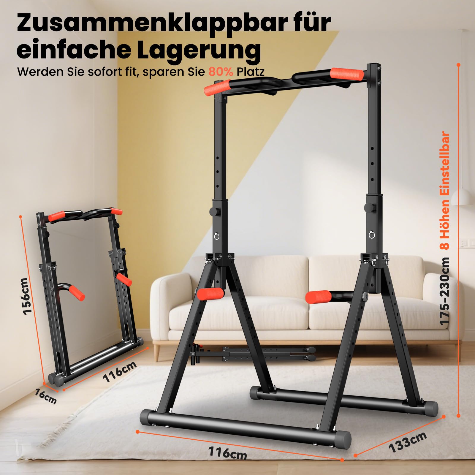 Dieses Multifunktionsgerät ermöglicht ein komplettes Ganzkörpertraining. Sie können Übungen wie Klimmzüge, Dips, Liegestütze, vertikale Knieheben und Ruderzüge durchführen, um gezielt Bauchmuskeln, Arme (Bizeps, Trizeps), Rücken, Brust, Schultern und Beine zu kräftigen.