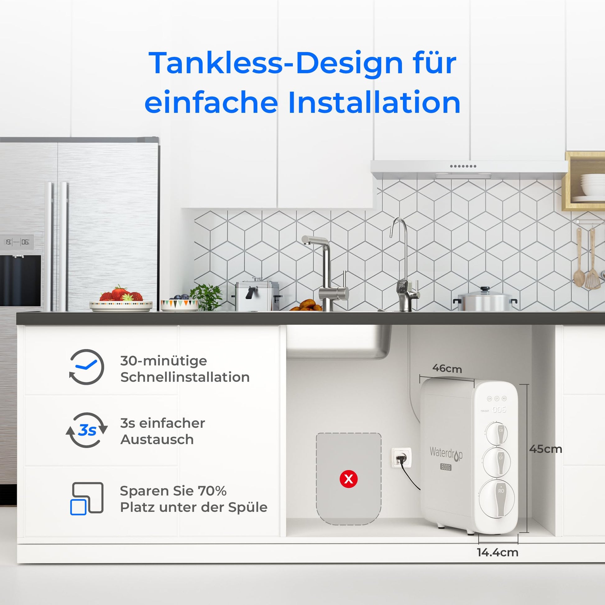 Nein, das System ist speziell für moderne Küchen konzipiert. Durch das kompakte, tanklose Design spart es bis zu 70 % Platz im Vergleich zu herkömmlichen Anlagen mit Wassertank und verhindert zudem die Verkeimung von stehendem Wasser.