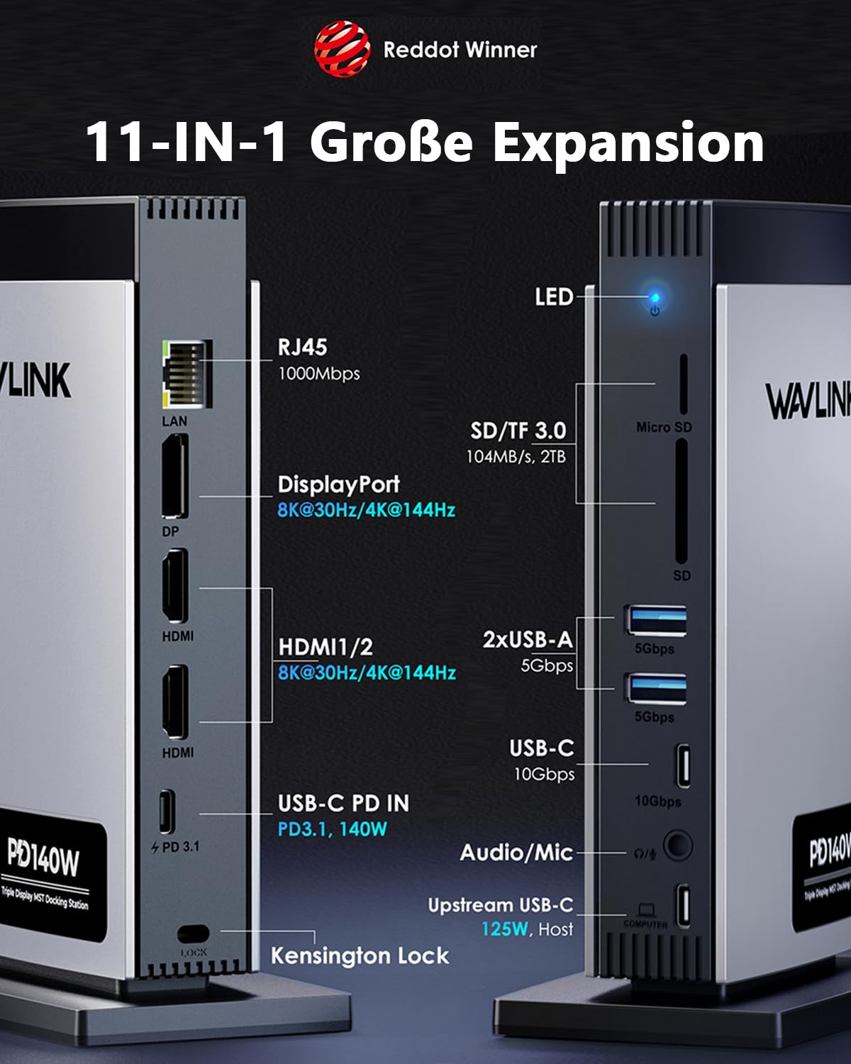 - 11-in-1 Anschlüsse: Bietet 2x HDMI, 1x DisplayPort, 1x USB-C PD 3.1 (Eingang), 1x USB-C Host (125W), 1x USB-C 3.2 (10 Gbit/s), 2x USB-A (5 Gbit/s), Gigabit Ethernet, SD/Micro-SD-Kartenleser und 3.5mm Audio.