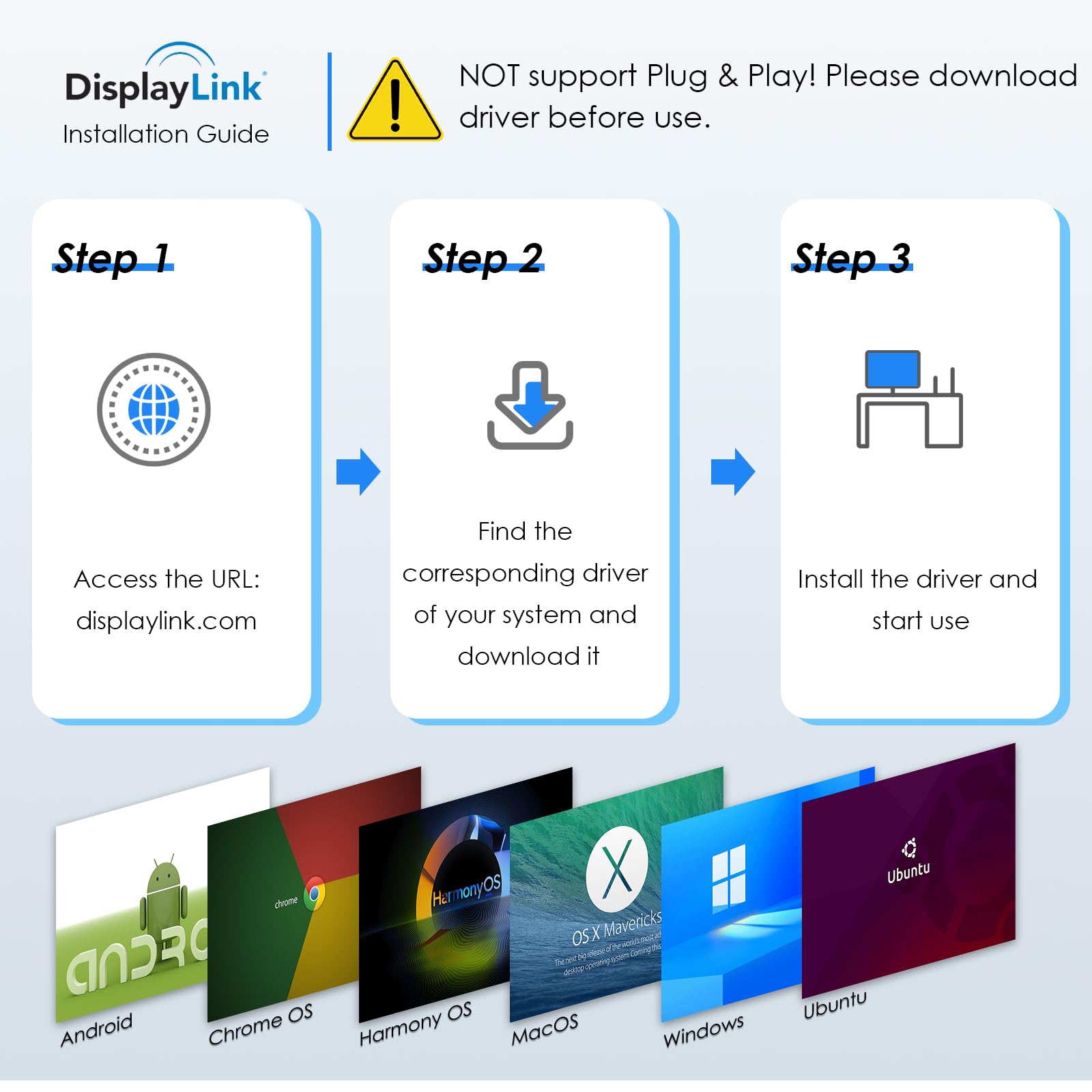 - Wichtig: Die Wiedergabe von HDCP-geschützten Inhalten (z.B. von Netflix) ist nicht möglich. Für die Inbetriebnahme ist die Installation des offiziellen DisplayLink-Treibers notwendig.