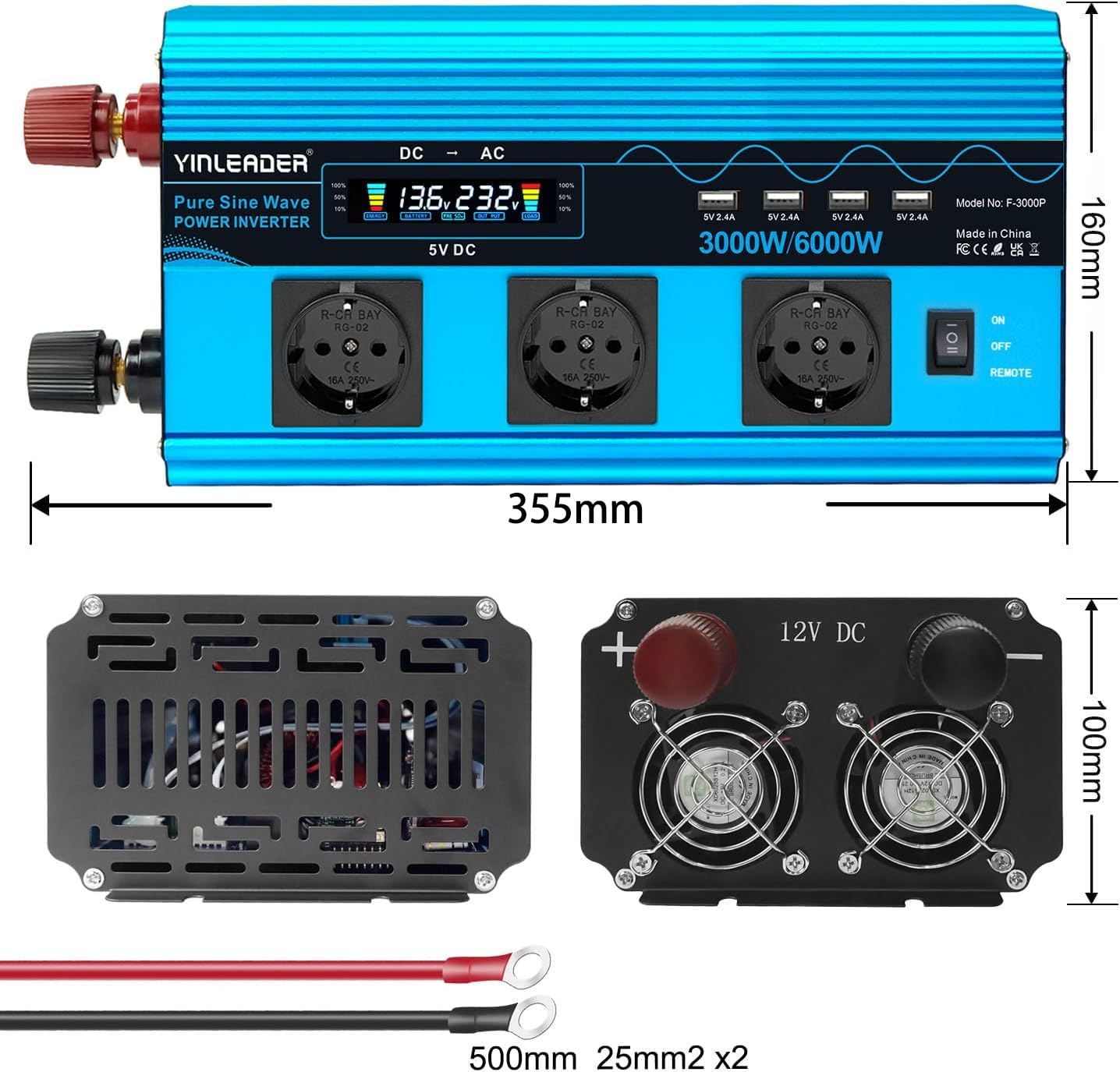 - Reine Sinuswelle: Liefert eine stabile Dauerleistung von 3000 Watt (6000 Watt Spitzenleistung) und wandelt 12V Gleichstrom in sauberen 230V Wechselstrom um – ideal auch für empfindliche Elektronik.