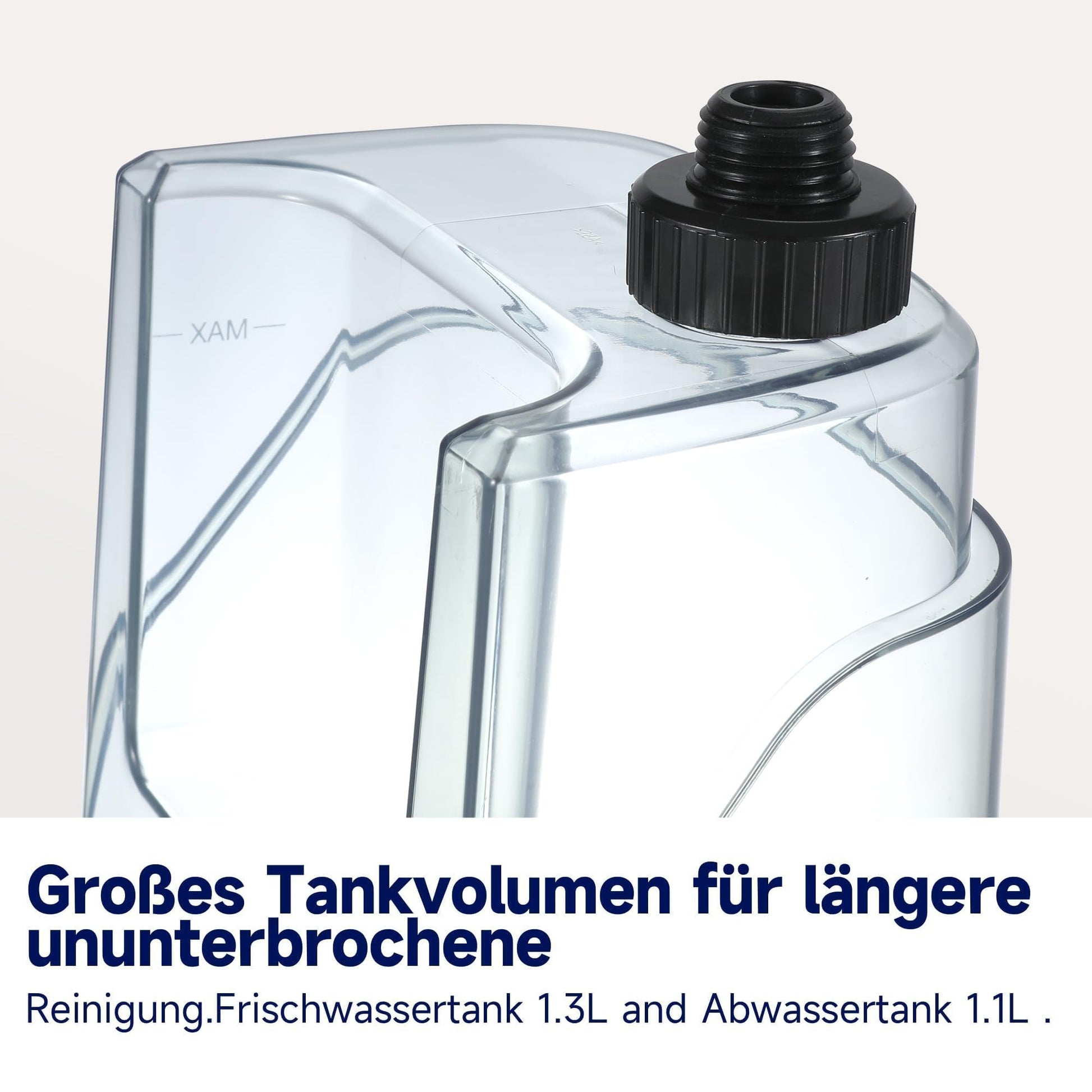 - Separates Zwei-Tank-System: 1,3 Liter Frischwassertank und 1,1 Liter Schmutzwassertank.