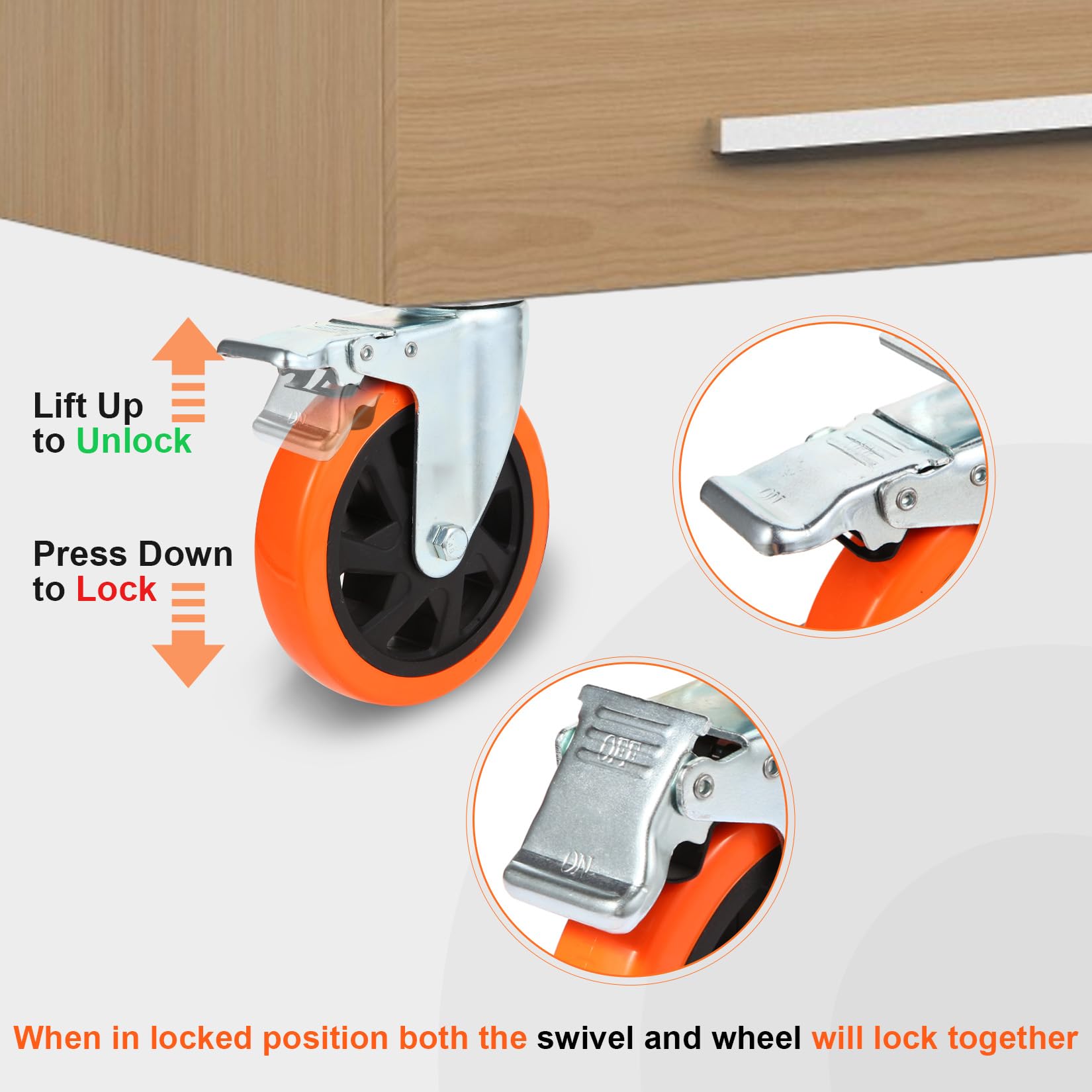 Die Doppelverriegelung ist ein wichtiges Sicherheitsmerkmal. Sie blockiert gleichzeitig die Rollbewegung des Rades und die 360°-Drehbewegung des Schwenklagers. Das sorgt für einen absolut festen und unbeweglichen Stand, wenn die Bremse aktiviert ist.