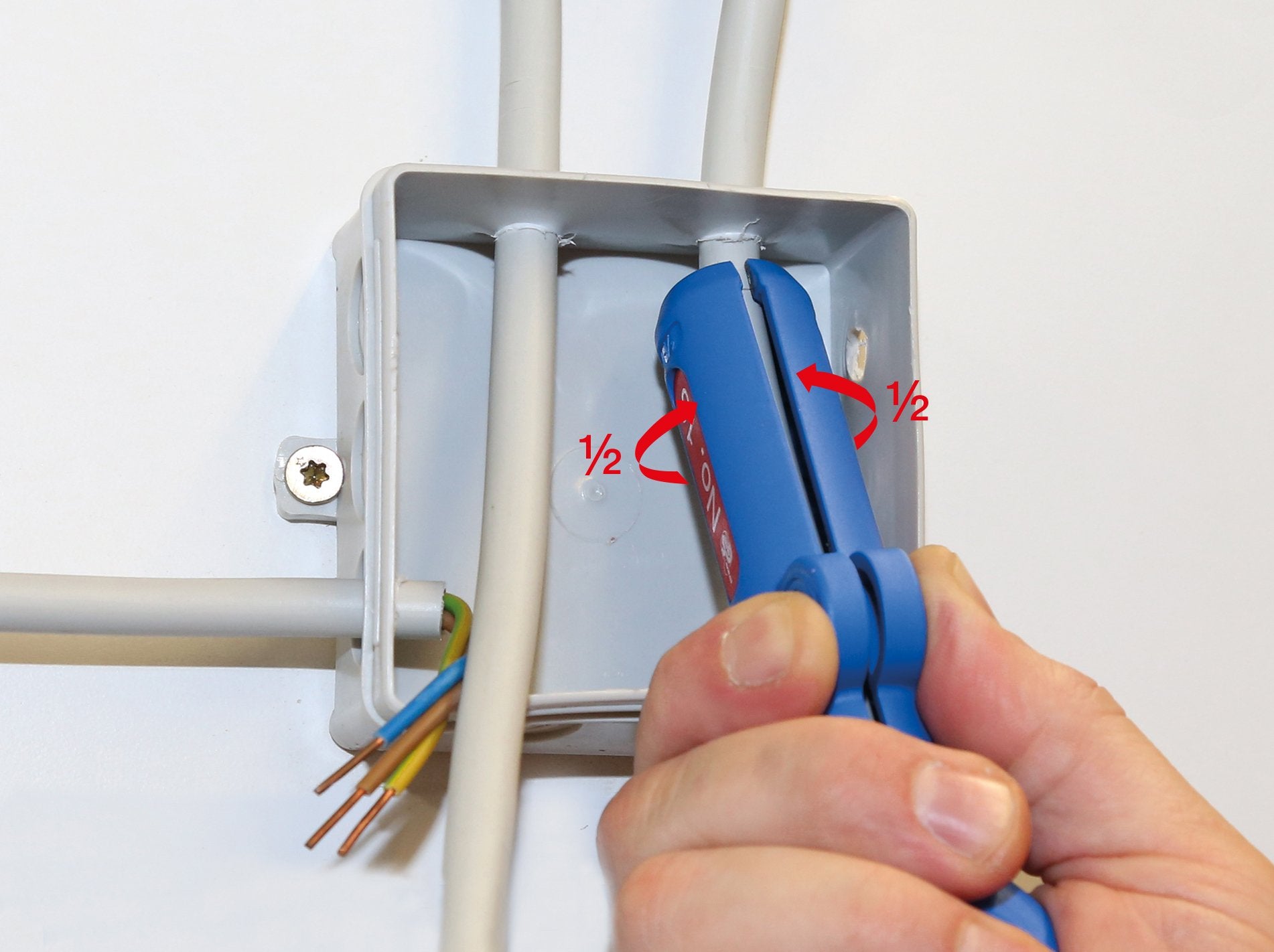 Die ergonomische Griffform des Entmantelers garantiert einen sicheren Halt und ermöglicht ein rutschfestes und kontrolliertes Arbeiten. Selbst in tiefen Hohlwanddosen, engen Abzweigdosen oder Schaltschränken liegt das Werkzeug optimal in der Hand. Dies führt zu einem gleichmässigen und bündigen Abisoliervorgang ohne Beschädigung der inneren Leiter.