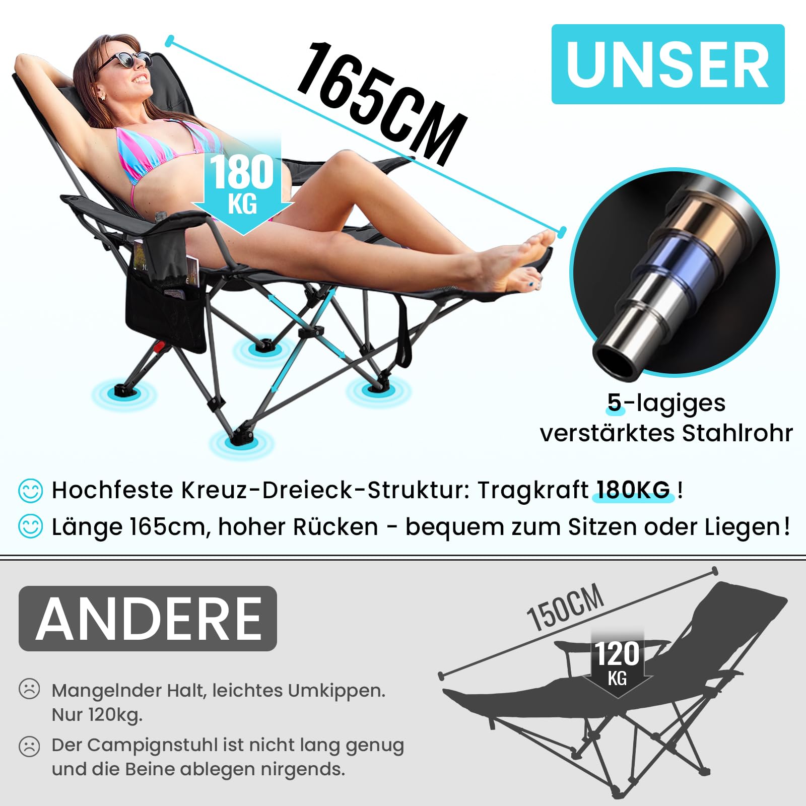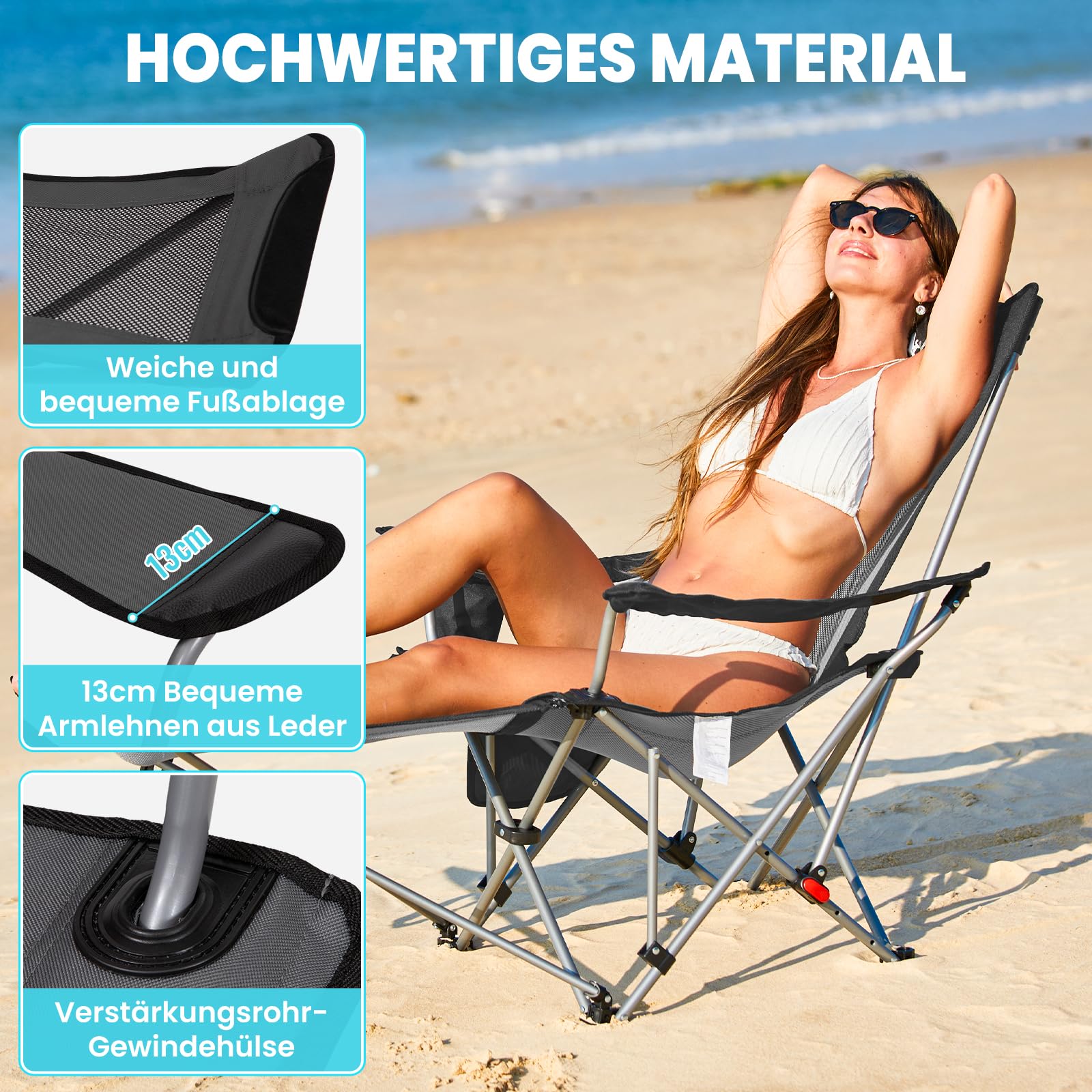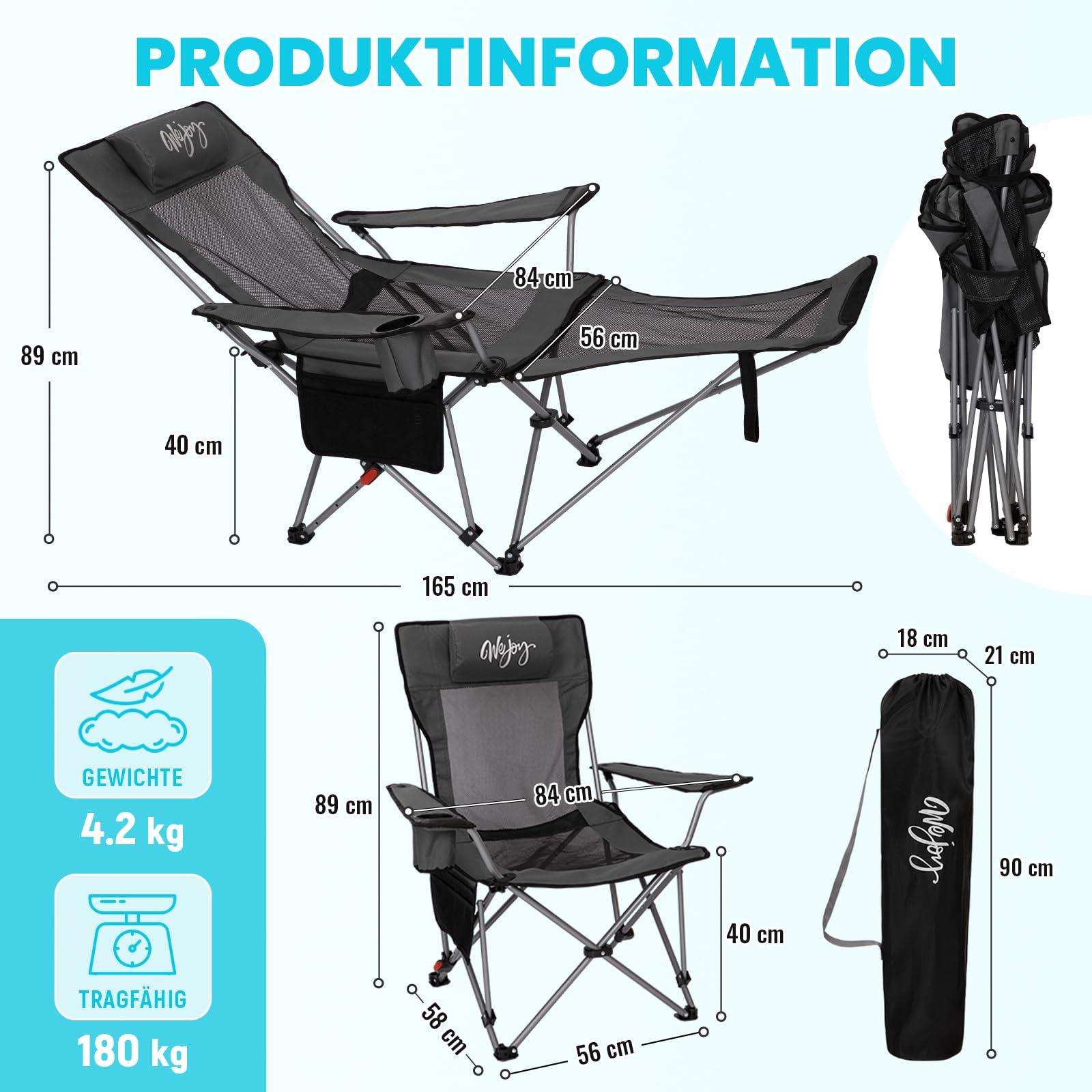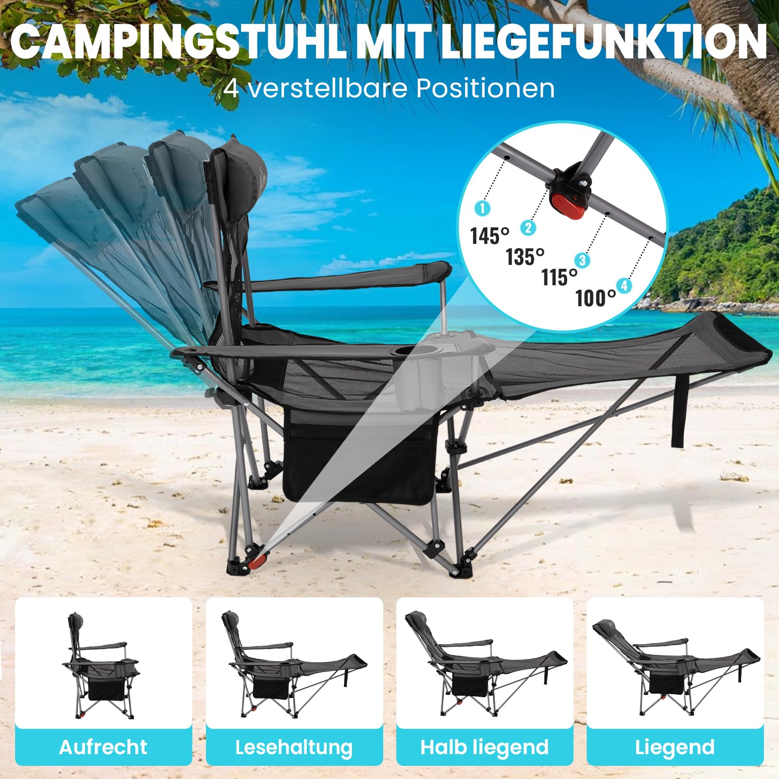 - Vierfach verstellbare Rückenlehne: Wählen Sie aus vier Positionen – vom aufrechten Sitzen bis zur bequemen Liegeposition für ein Nickerchen im Freien.